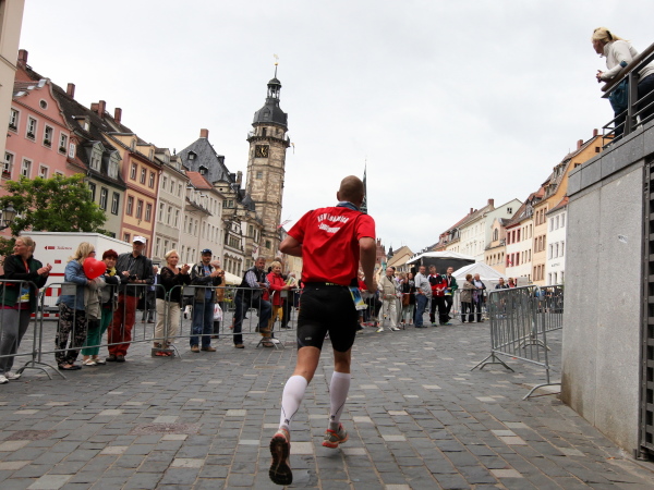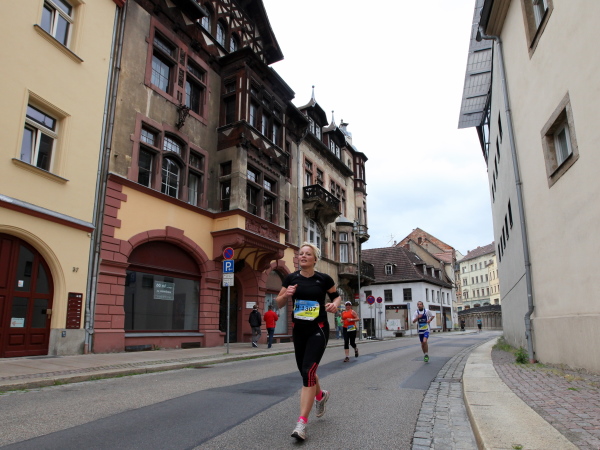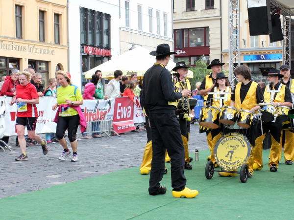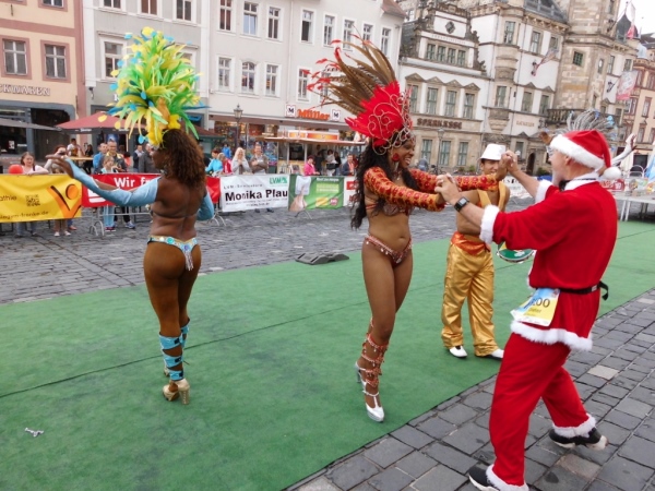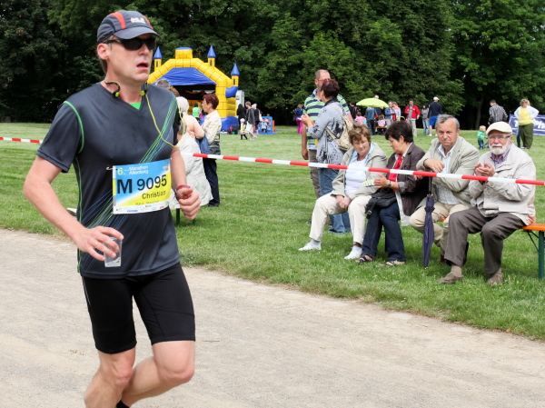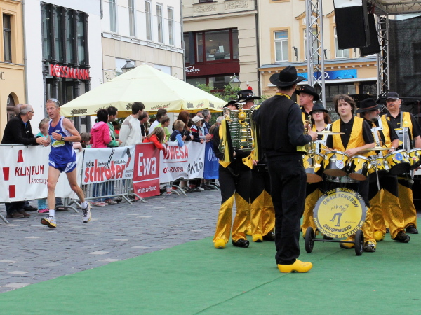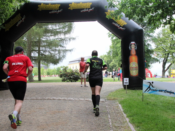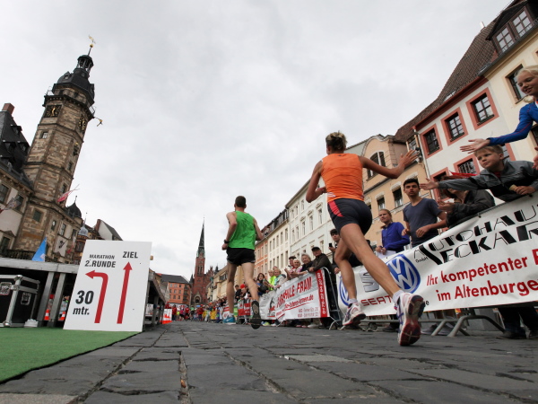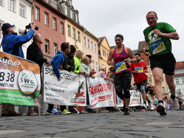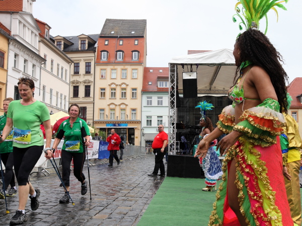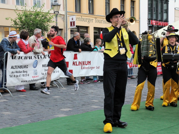 Aber ich bin trotzdem etwas verärgert. So nett dass hier auch alles ist – wo sind meine Sambatänzerinnen? Nicht da! Ich bin enttäuscht, vor Enttäuschung vergesse ich in die zweite Runde abzubiegen und laufe Richtung Ziel. Obwohl, das stimmt nicht ganz. Denn ich vergesse hier fast jedes Jahr abzubiegen. Aber auch auf unter Orientierungslosigkeit leidende Läufer sind die Altenburger Organisatoren vorbereitet. Da steht einer, der mich wieder einfängt und auf den richtigen Weg bringt.