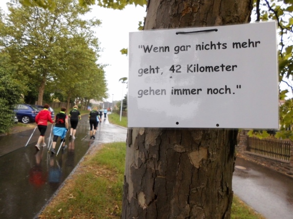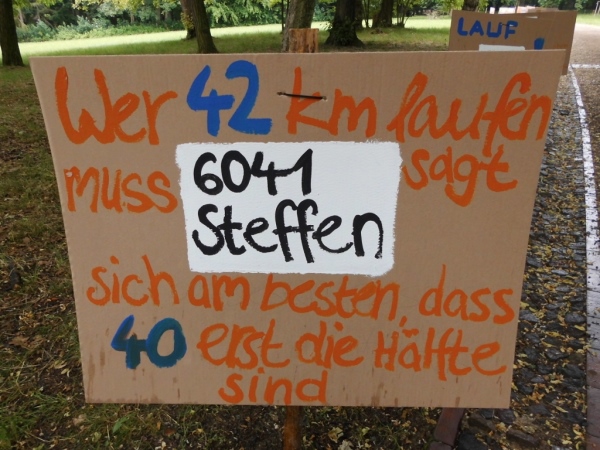 Gut, dass wir jetzt zu zweit sind. Da können wir im Schlossgarten die Schilder mit den klugen Sprüchen zählen, die für uns Läufer aufgestellt wurden. Ich schlage vor, der Weihnachtsmann zählt am rechten Wegrand, ich am linken. Umgekehrt wäre für mich besser gewesen. Der Weihnachtsmann kommt auf 23, ich muss mehr leisten, auf meiner Seite stehen 72 Schilder. Macht zusammen 95 - ungefähr… Welcher Marathon in Deutschland hat da eigentlich mehr zu bieten?
