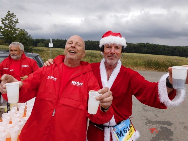 Für mich beginnt Runde zwei. Ich kann es kurz machen, sie ist identisch mit Runde eins. Außer dass es etwas einsamer um mich geworden ist: Logisch, 125 Läufer verteilt auf 42 Kilometer, da hält sich das Gedränge in Grenzen… Aber die Stimmung bleibt. Als ich eine Verpflegungsstelle erreiche, höre ich die Helfer, bevor ich sie überhaupt sehe. Die singen mal wieder, passend zur Jahreszeit: „Schneeflöckchen, Weißröckchen…“ Vor mir ist der Weihnachtsmann und gemeinsam legen wir die letzten Kilometer zurück. Zum Teil im Regen – das musste nicht sein…