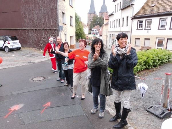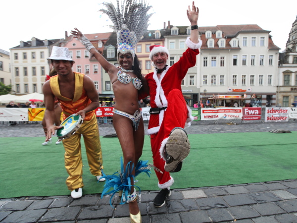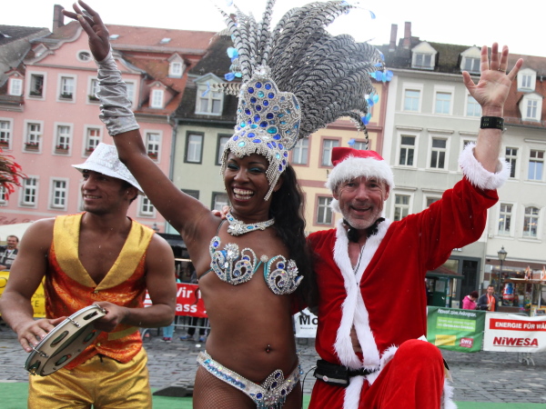 Gemeinsam erreichen Weihnachtsmann Dieter Fromme und ich das Ziel. Der Besucherandrang hat etwas nachgelassen, nicht aber die Stimmung. Und was mir ohnehin das Wichtigste ist – meine Sambatänzerinnen sind da!