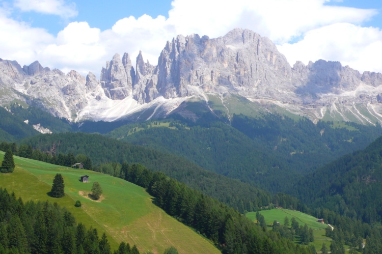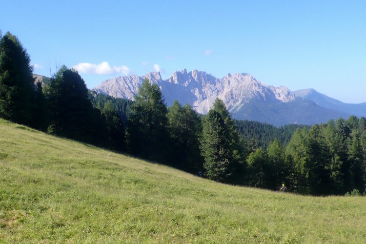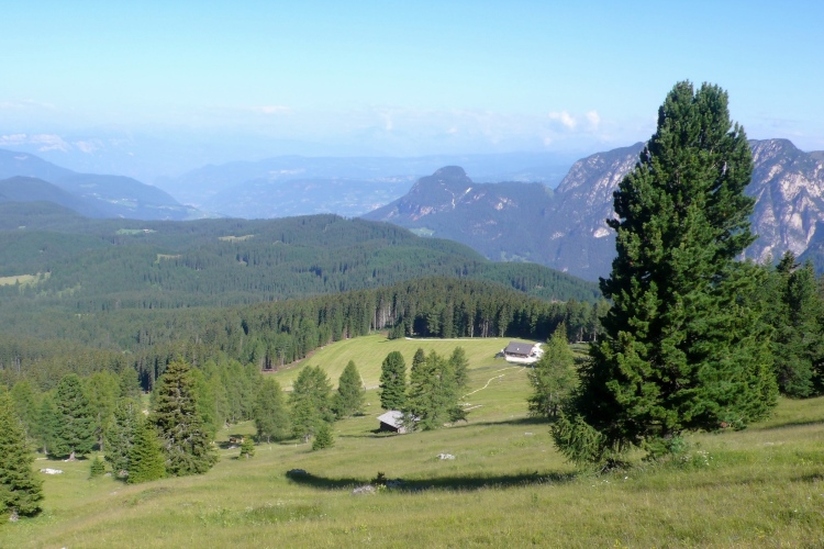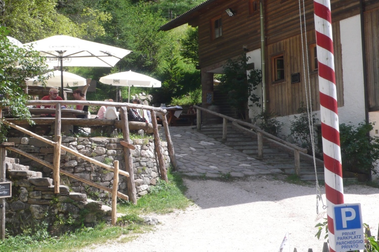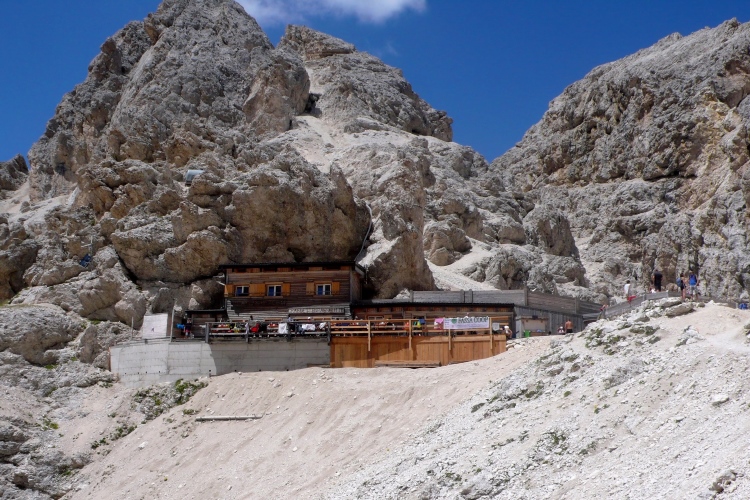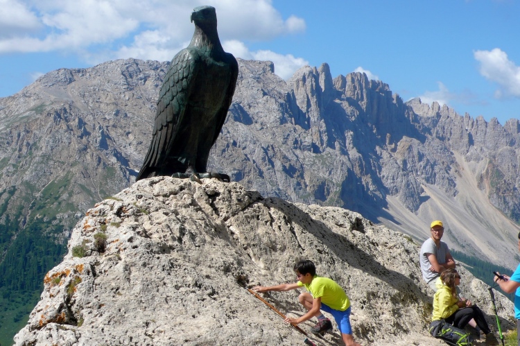 Links liegt der Bergstock. Den Rosengarten mit den markanten Vajolettürmen kann ich noch identifizieren, dann weiß ich nur noch, nach Süden und dann drum herum. Am südlichsten Punkt steht ein Adler, guckt würdevoll auf die Wanderer. Errichtet 1912 zu Ehren des Herrn Christomannos, ein Förderer des alpinen Tourismus. Nicht weit weg, wieder eine Versorgung. Cola. Das Leben.