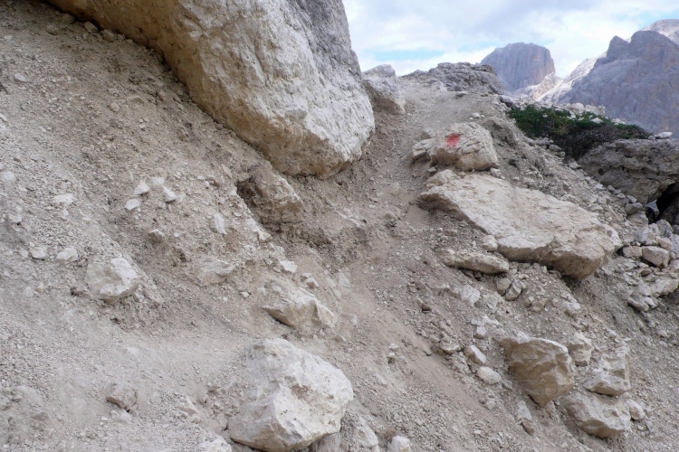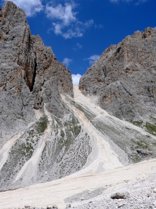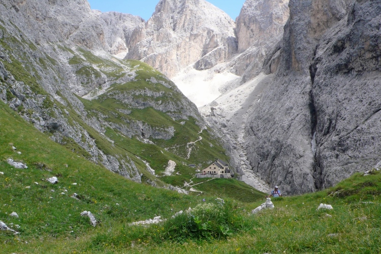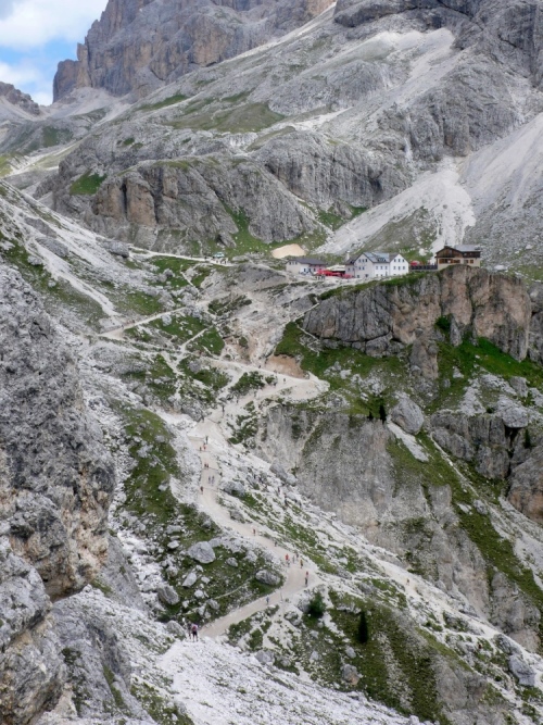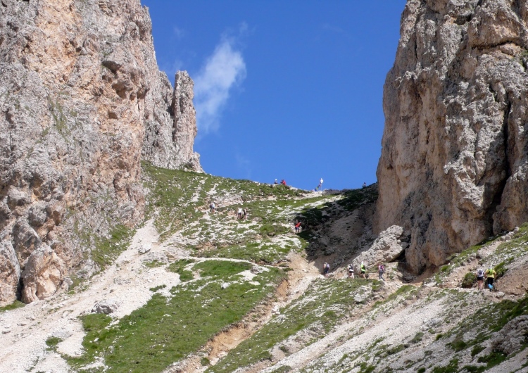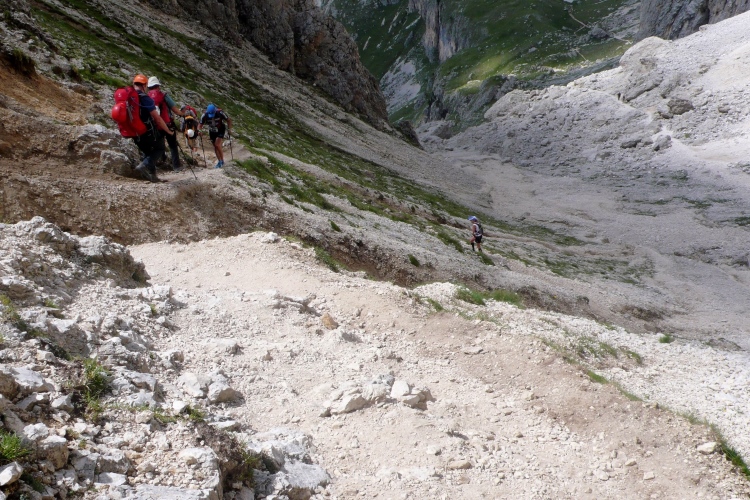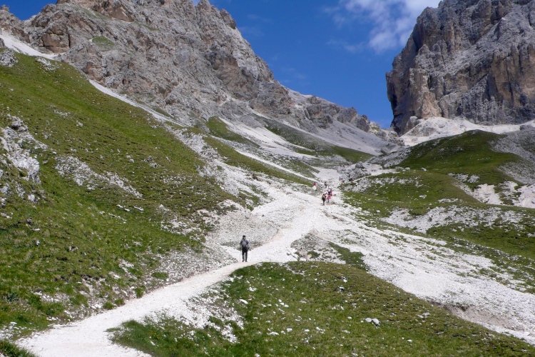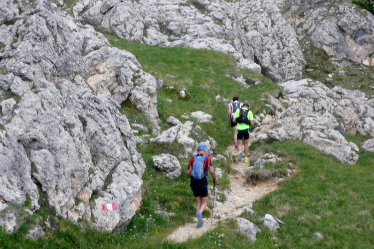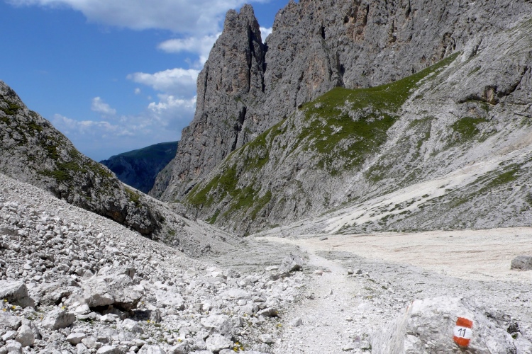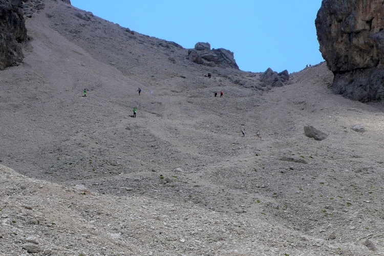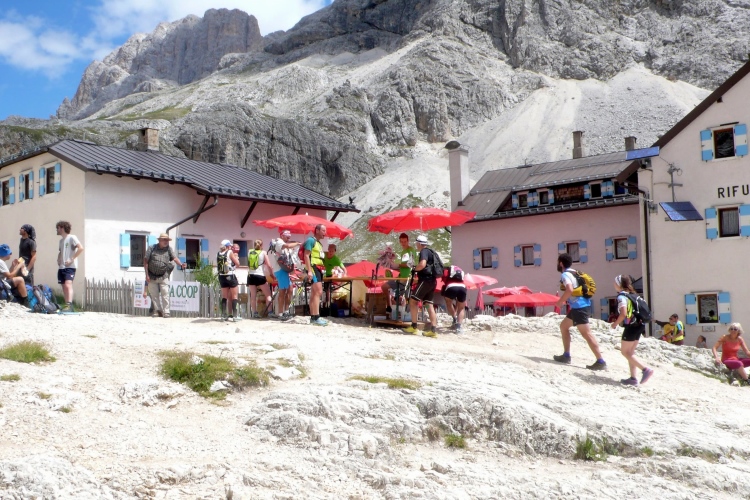 Der erste große Pass, der Cigoladepass, muss überquert werden. In weitem Bogen unter den gigantischen Felstürmen erreichen wir die Vajolethütte. Der Blick zurück ist gigantisch! Nur eine kurze Pause, das Team scopa (Besen!) ist nämlich auch schon da. Vor lauter Begeisterung bin ich wohl etwas zurückgefallen. Aber noch ist Zeit, rauf zum Grasleitenpass, 2600m. Hoch auf gutem Weg. Es sind viele Tageswanderer und Kletterer unterwegs, richtig was los hier. Und alle ackern wie blöd. Nur das Team Scopa nicht. Sie haben Spaß, sammeln die Wegefähnchen ein und -ab und zu- ein lauter Jodler. Die sind richtig gut drauf. Oben auf dem Pass ist ein cut off, 6 Stunden.