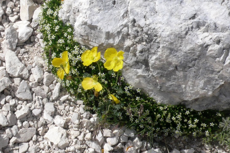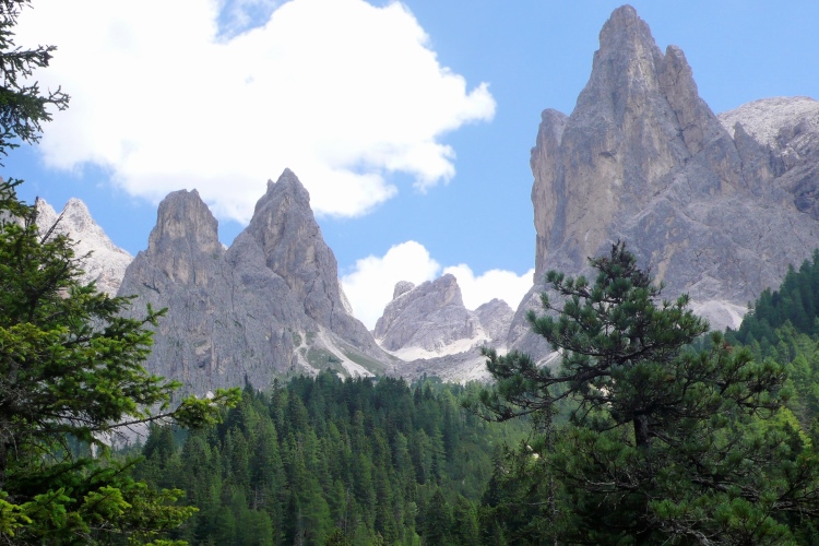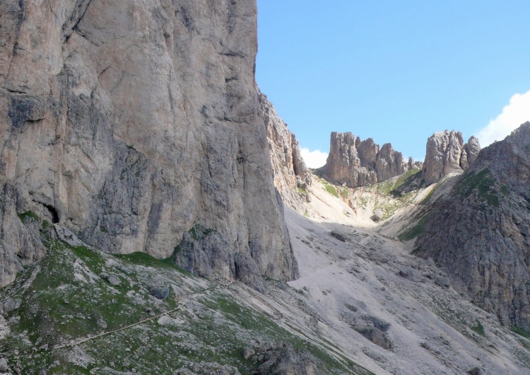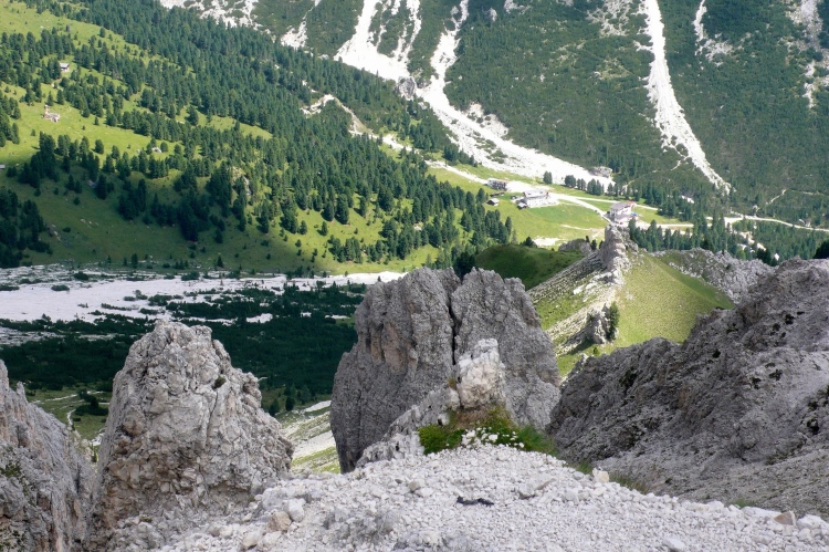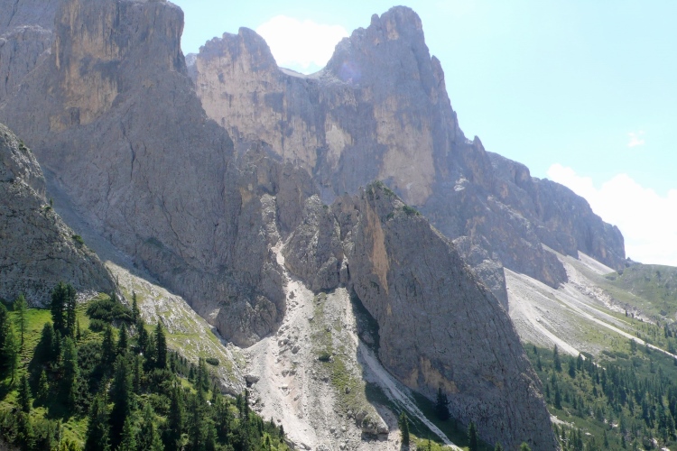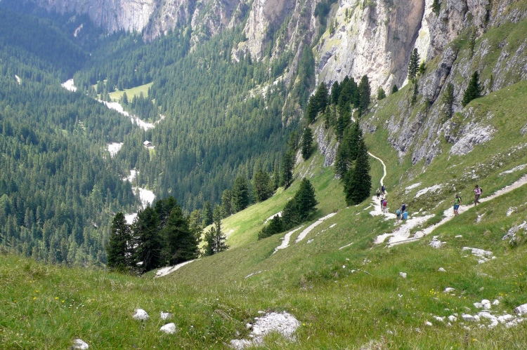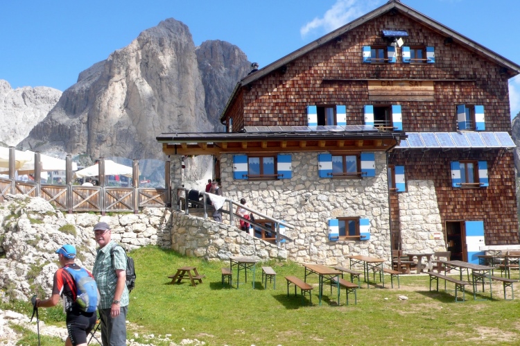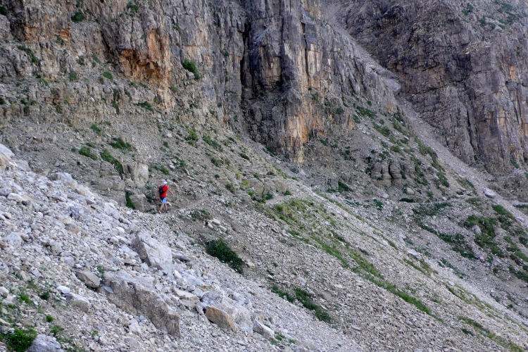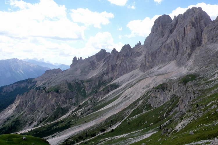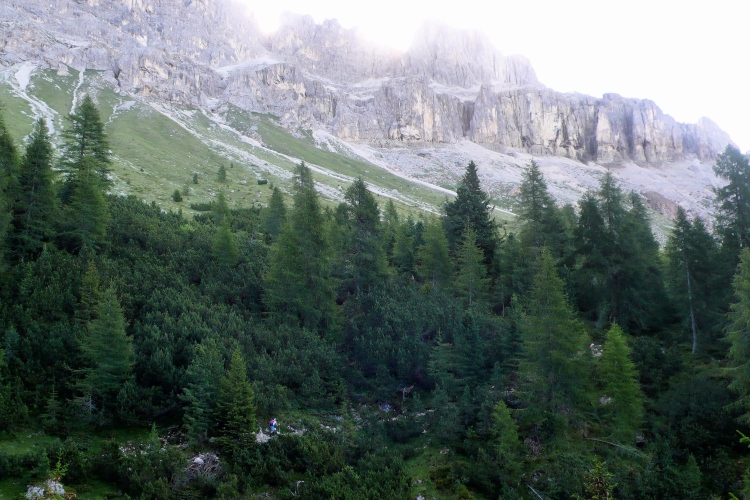 Der erste große Pass, der Cigoladepass, muss überquert werden. In weitem Bogen unter den gigantischen Felstürmen erreichen wir die Vajolethütte. Der Blick zurück ist gigantisch! Nur eine kurze Pause, das Team scopa (Besen!) ist nämlich auch schon da. Vor lauter Begeisterung bin ich wohl etwas zurückgefallen. Aber noch ist Zeit, rauf zum Grasleitenpass, 2600m. Hoch auf gutem Weg. Es sind viele Tageswanderer und Kletterer unterwegs, richtig was los hier. Und alle ackern wie blöd. Nur das Team Scopa nicht. Sie haben Spaß, sammeln die Wegefähnchen ein und -ab und zu- ein lauter Jodler. Die sind richtig gut drauf. Oben auf dem Pass ist ein cut off, 6 Stunden.