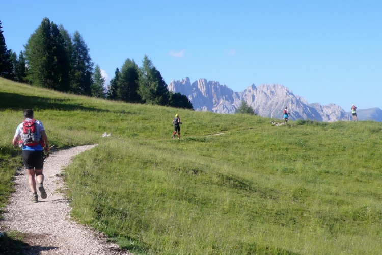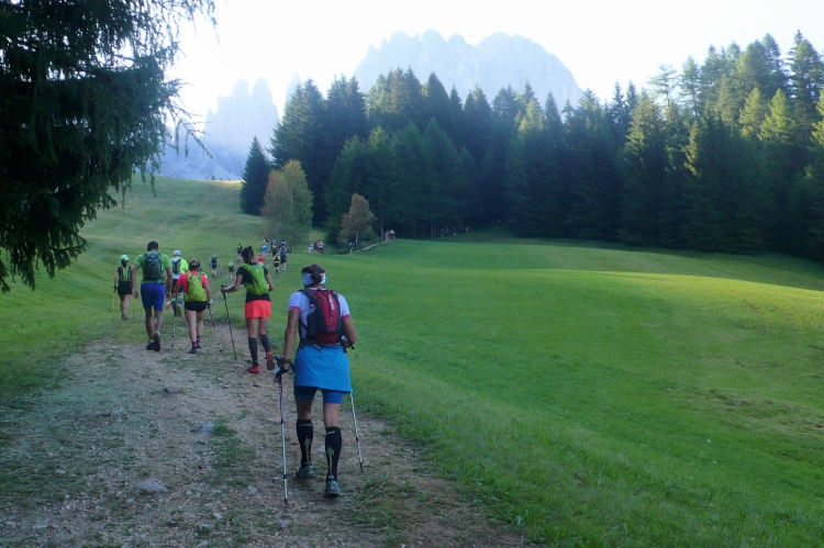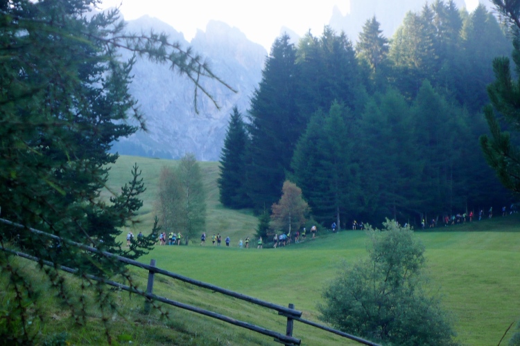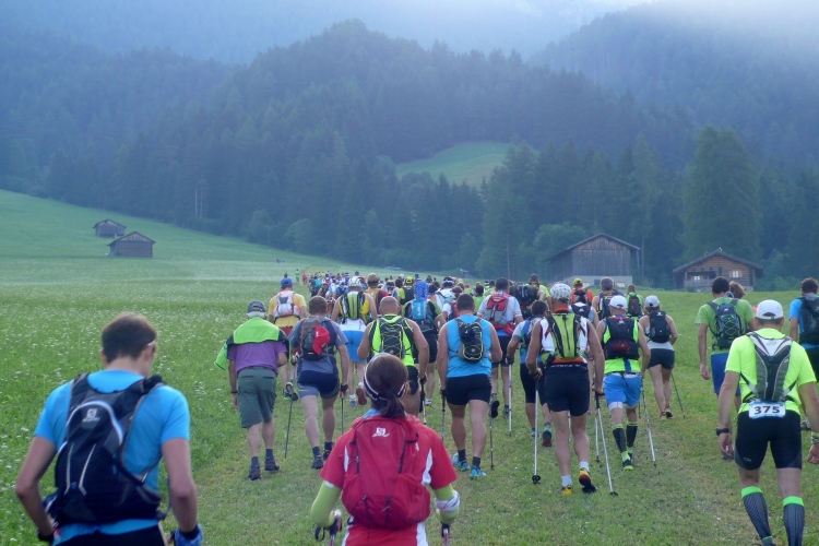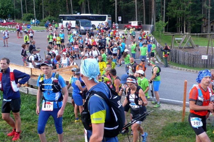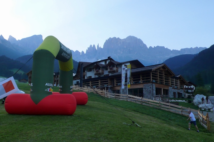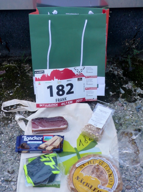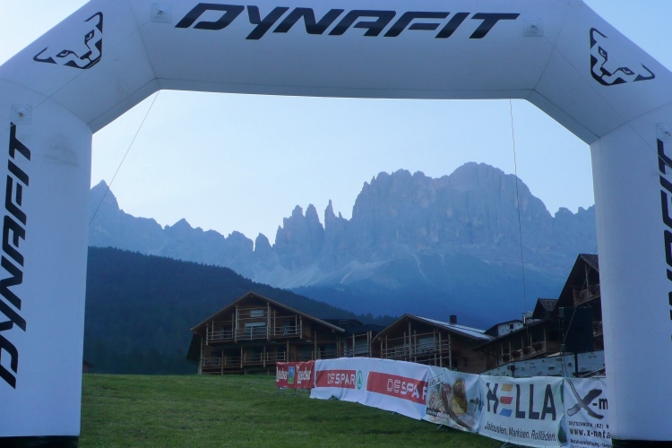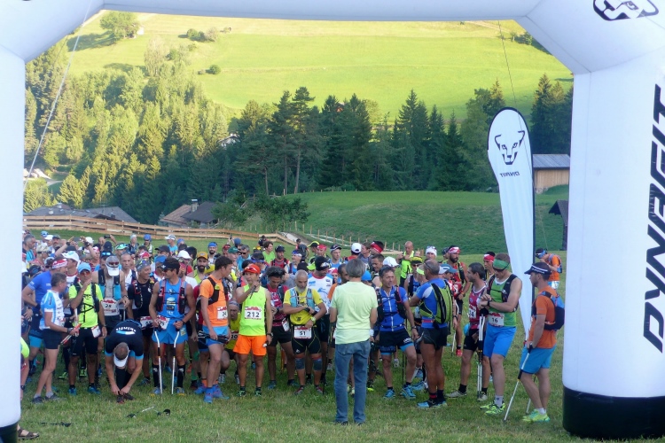 Die bizarren Berge des Rosengarten bilden zusammen mit dem Schlern einen von der Unesco geadelten, gewaltigen Naturpark. Alles ist und bleibt wild. Und da hinein schickt uns der Veranstalter. 2016 gab es einen Testlauf, nur mit Eingeweihten, jetzt beginnt die erste öffentliche Austragung. Vorbildlich und sehr sorgfältig ist alles organisiert. Vom Starterpaket mit vielen Überraschungen (Schüttelbrot, Armlinge, Räucherschinken usw.) bis zum Shuttleservice, alles läuft präzise und reibungslos ab. Noch ein Briefing, es knallt, und ab.