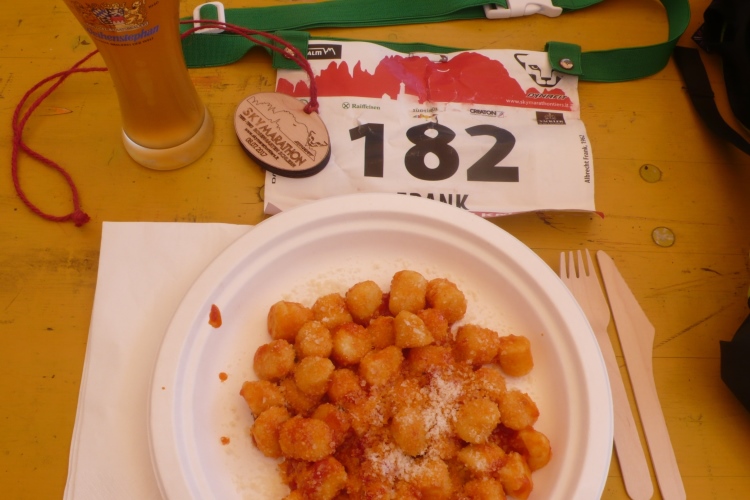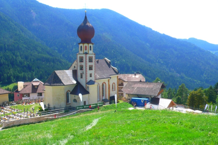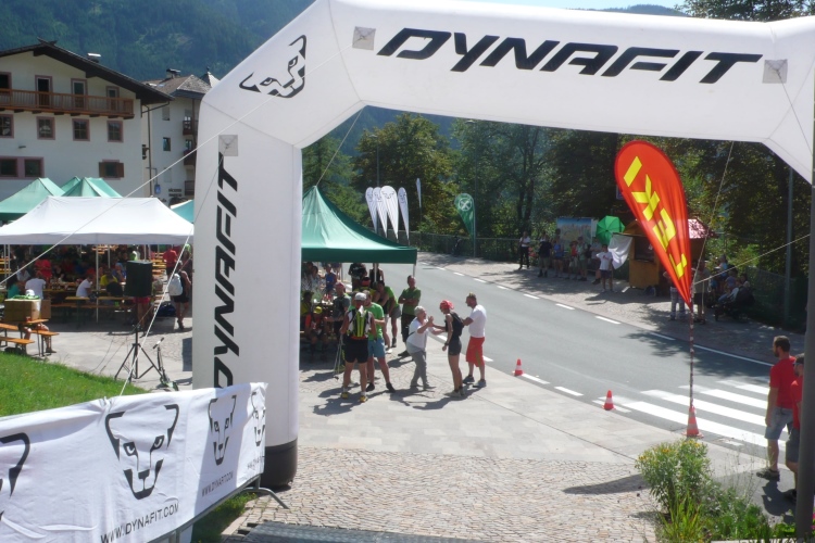 Letzter VP die Tschaminschwaige. Ein Glas Wasser geht noch. Und nun, exklusiv für die „Abkürzer“: Ein paar Meter Asphalt. Geht nicht anders. Noch eben am Hotel Panorama vorbei (nomen est omen), wieder Schotter, Häuser und Höfe und ein Rosengarten in klein. Passt ja. Recht spät erblickt man den Kirchturm von Tiers, daneben ist das Ziel. Hier treffen beide Strecken wieder zusammen. So komme ich mit anderen Marathonis zusammen an.