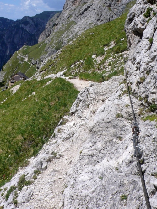 Dieser Teil der Strecke war also nicht vorgesehen. Durch fürchterliches, loses Geröll arbeite ich mich runter. An so mancher Stelle, auch schon vorher, ist der Weg einfach weggewaschen. Klettereinlagen lockern auf. Kurze Sprünge, Flanke über den Fels, Handarbeit... das ist Hochgebirgstrail! Etwas weiter unten sogar mit Drahtsicherung.