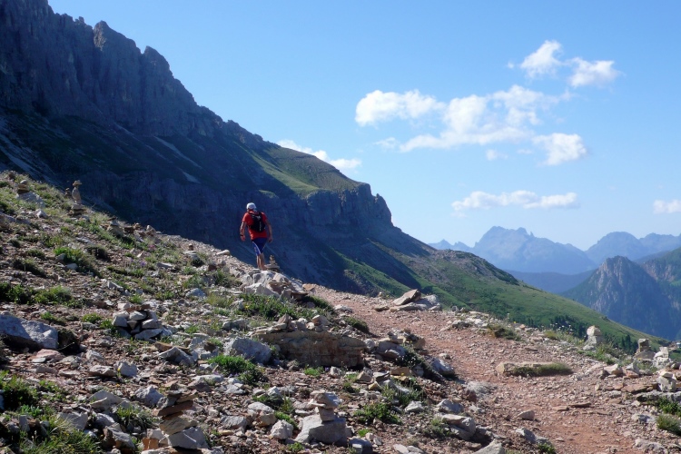 Ich bin noch gut in der Zeit, aber mein Knie sagt mir, den nächsten Pass hoch, ja, da bring ich dich noch hin. Aber dann sieh zu, wie du wieder runterkommst. Ohne mich. Verhandlungen sind sinnlos, ich weiß ja, wie stur mein Knie sein kann. Also nehme ich die unerwartete Abkürzung. Hier, am Abhang, zweigt die 35km-Strecke ab. Ein letzter Blick auf den Molignonpass, der mir nun entgeht. So ist das nun mal. Nächstes Jahr dann eben.