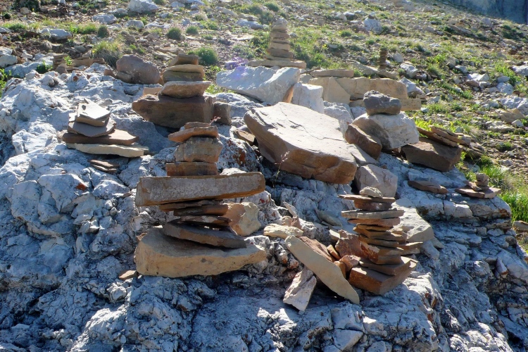 Auf schmalen Steigen geht es weiter. 6 km sind es, aber erstmal 250 m hoch, wieder runter, in Serpentinen, auf Steinen und losem Geröll. Eins meiner Knie findet das nicht so toll und beginnt einen zaghaften Protest, was mein Bergab-Tempo drosselt. Blöd. Aber das Panorama ist gewaltig. Ein Blick zurück lohnt sich immer!