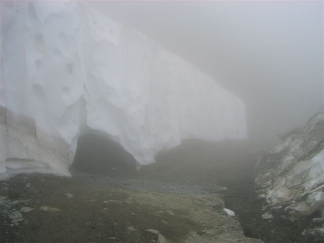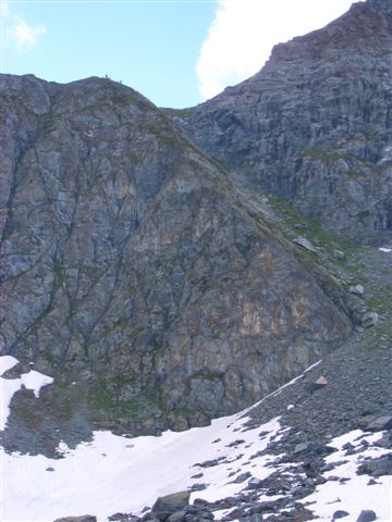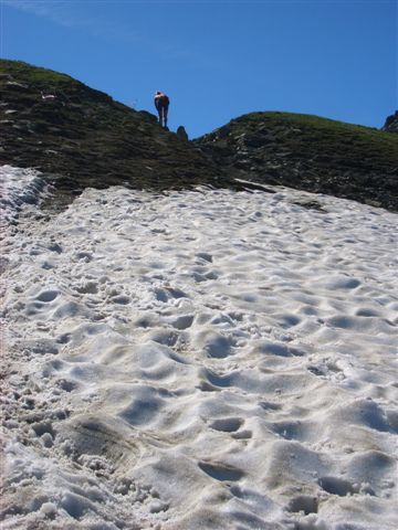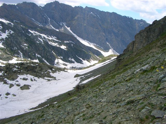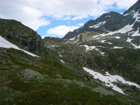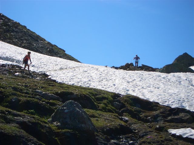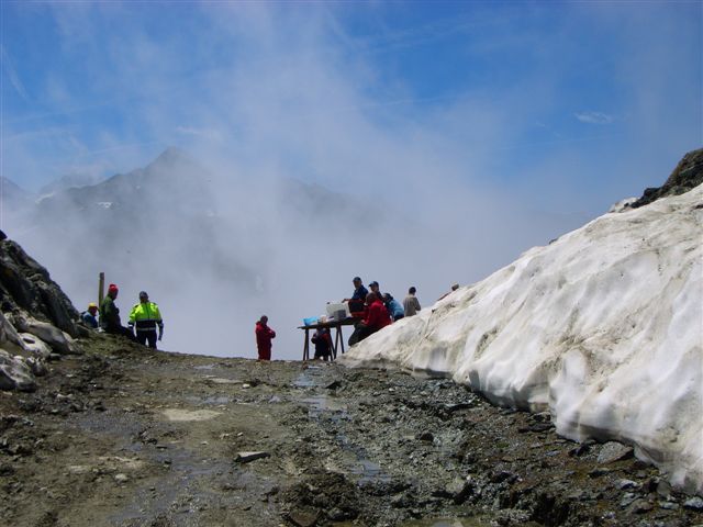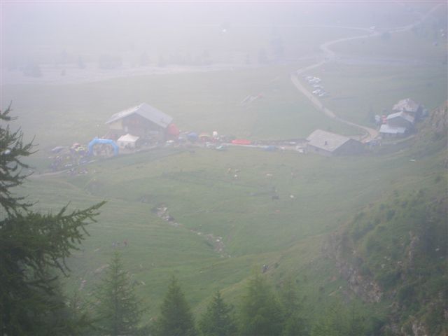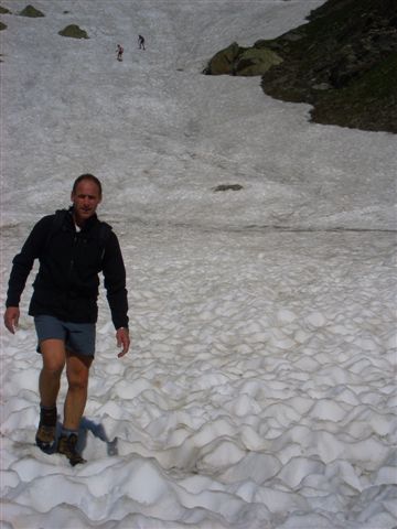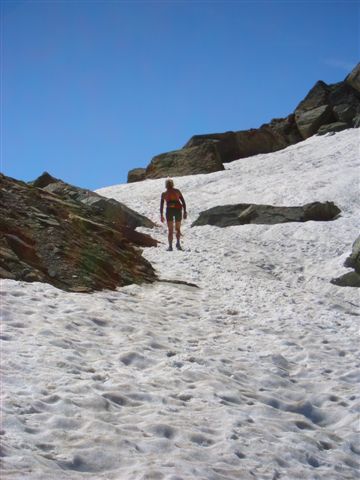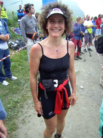 Ein Skyrace birgt schon auf Grund der alpinen Wege genügend Gefahren, wenn hier falscher Ehrgeiz die Hauptmotivation darstellt, steigt die Verletzungsgefahr enorm. Bei mir geht alles gut, ich komme sicher über das Schneefeld, aber die ungewohnte Belastung hat meine Oberschenkel arg mitgenommen. Unten beim Refugio Willi Jervis (1732 Hm) massiere ich die schmerzenden Stellen, esse und trinke ein wenig von den Leckereien und halte nach der persönlichen Fangemeinde Ausschau. Aber ich kann sie nirgends entdecken. Sind wohl noch mal richtig eingeschlafen, die Schlafmützen. Aber das ist schon in Ordnung. Hier ist der erste Kontrollpunkt für die Marathonstrecke. Die Frauen haben 5.30 Zeit, um hier her zu kommen. 4:15 habe ich gebraucht, ich bin mit mir total zufrieden.