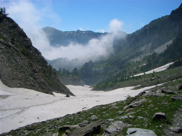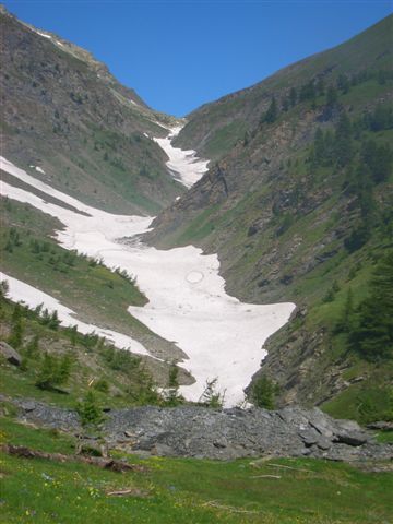 Die folgende Marathonstrecke verläuft überwiegend im Barant-Naturpark, der vor kurzem in die EU „Habitat“ Liste der Naturreservate aufgenommen wurde. Der Lanzas, ein vollkommen schwarzer Alpensalamander, lebt ausschließlich in dieser Gegend. Aber auch andere seltene Tiere und Pflanzen finden hier ihre Heimat. Man quert das breite Talbecken des Pellice Baches, um dann gleich wieder steil ansteigend den colle Barant (2.373 Hm) zu erklimmen. Von hier geht es auf einem Waldweg hinunter zum Rifugio Barbara Lowrie, dem zweiten Kontrollpunkt. Mittlerweile habe ich die Uhr eingepackt, sie würde mir nichts nutzen, denn schneller laufen kann ich nicht mehr. Und ich habe auch vergessen, wann ich hätte hier sein müssen. Beim Versorgungspunkt scherze ich mit dem netten Helfer auf französisch, aber Scheinbar ist alles in Ordnung, er muntert mich auf und lässt mich weiter laufen. Offensichtlich wartet man sogar noch auf weitere Läufer. Das überrascht mich, denn schon lange habe ich keine anderen mehr gesehen. So allein auf weiter Flur, bin ich jetzt froh, dass die Strecke gut ausgeschildert ist.
