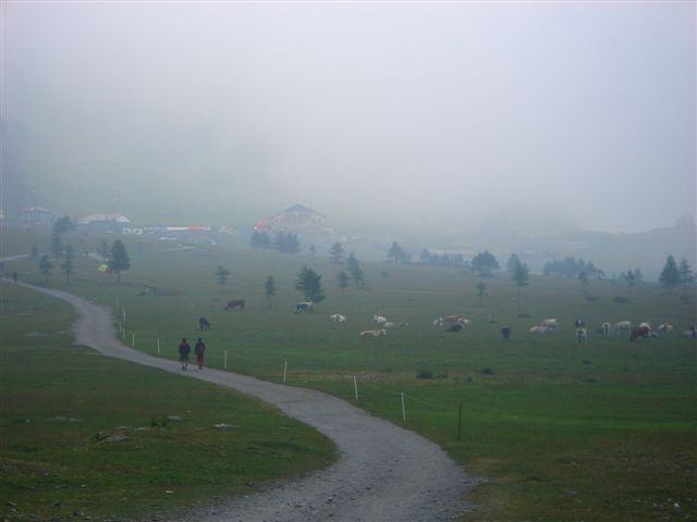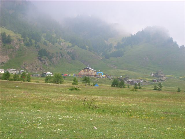 Aber Aussicht hin oder her, mein Weg führt auf der anderen Seite steil hinunter ins Tal zum Ziel. Jetzt muss ich nur noch die müden Knochen vorsichtig dorthin tragen, dann wird mich Reinhold feste drücken und alles ist gut. Beim Abstieg kommt man an der dritten Alpenvereinshütte vorbei, der Rifugio Monte Granero. Hier treffe ich auf eine Schweizer Wandergruppe, die mich vor Stunden schon einmal gesehen hat. Sie sind direkt hier herauf gelaufen, es ist ein lustiges Wiedersehen. Nicht mehr ganz so lustig fühlen sich nun meine Oberschenkel an. Jeder Schritt bergab schmerzt heftig. Gerne würde ich einen Anstieg gegen den Abstieg tauschen. Doch auch hier meistert jeder Schritt das Problem und bald erreiche ich den flachen Talboden des Pelliche Baches. Was bin ich glücklich, das Refugio Willy Jervis aus dem Nebel auftauchen zu sehen. Reinhold ist da und drückt mich fest, auch Birgit und Claus schließen sich an.