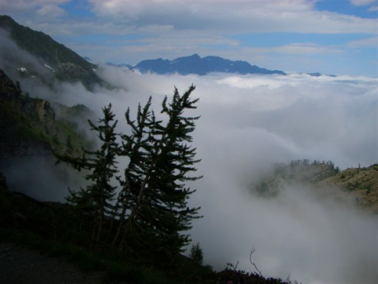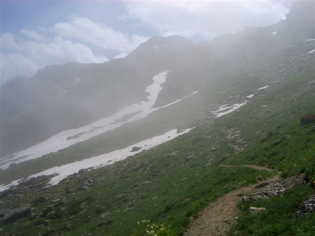 Und zum vierten Mal wiederholt sich dasselbe Spiel: mit der Baumgrenze weicht der Nebel und gibt die Sicht frei. Ich bin nicht sicher, ob mir das gerade jetzt so recht ist, denn nun sehe ich, das steilste und schwierigste Stück liegt direkt vor mir. Wie meistert man schwere Aufgaben? Schritt für Schritt trage ich meinen müden Körper langsam weiter und der ruhige, gleichmäßige Rhythmus fühlt sich nach einer Weile richtig gut an. Viele Wanderer kommen mir hier entgegen, sie sind fasziniert von den verrückten Läufern und muntern mich mit Beifall auf. Der Anstieg gelingt leichter als erwartet. Ein gutes, glückliches Gefühl breitet sich in mir aus. Oben am Colle Manzol (2.701 Hm) hätte man eine herrliche Aussicht in Richtung Poebene, wenn dieser watteweiche Nebel nicht wäre.