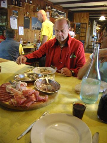 Wir essen in der Hütte lecker und ausgiebig und können uns das Glas Rotwein nicht verkneifen. Später wanken wir glücklich den Weg hinunter nach Villanova. Birgit hat mir Wanderstöcke mitgebracht, die kann ich gut gebrauchen. Weil wir zu spät sind, haben wir den letzten Gratisläuferbus verpasst, aber ein netter Mensch, der den ganzen Tag in den Bergen bei seinen Tieren war, nimmt uns mit und setzt uns bei der Pizzaria in Bobbio Pellice für das zweite Nachtessen wieder aus.