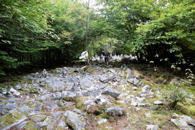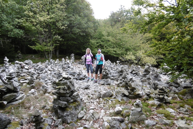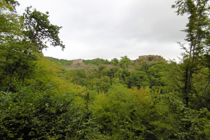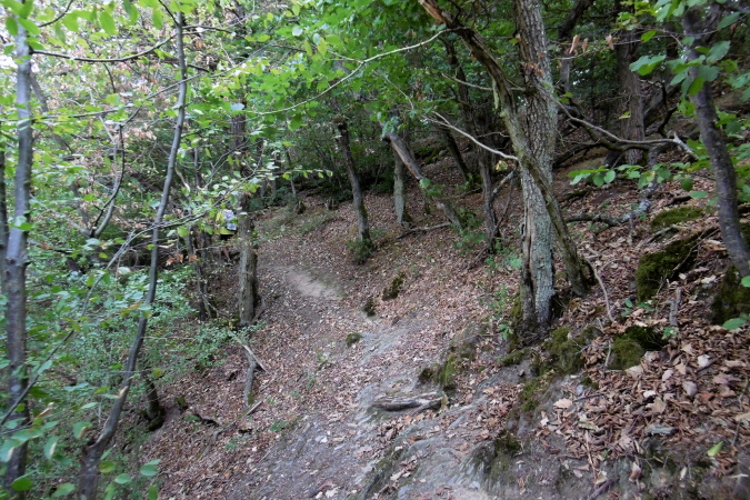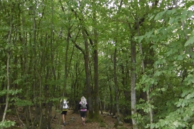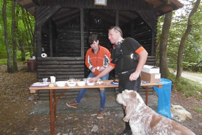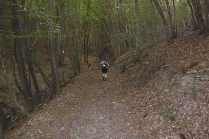 Kaum hatten wir das Städtchen Kirn hinter uns gelassen, befanden wir uns auf einem recht anspruchsvollen Trail, der uns gleich zur ersten Sehenswürdigkeit, dem Kallenfels bei Hahnenbach brachte. Immer wieder hatten wir eindrucksvolle Ausblicke ins tief unten liegende Hahnenbachtal. Der teils felsige Pfad führte uns dann weiter zum Schloß Wartenstein (km 5,3). Entlang unseres Weges kamen wir durch hochgewachsene Buchenwälder, später dann durch niedrig gewachsene Eichenwälder. So waren die ersten 12 Kilometer bis zum Rudolfshaus, unserer ersten VP, sehr abwechslungsreich und kurzweilig. Und so sollte es dann auch weiter gehen!