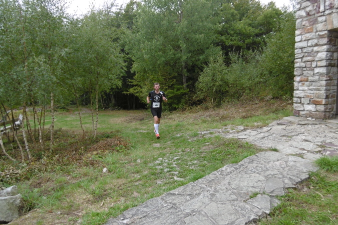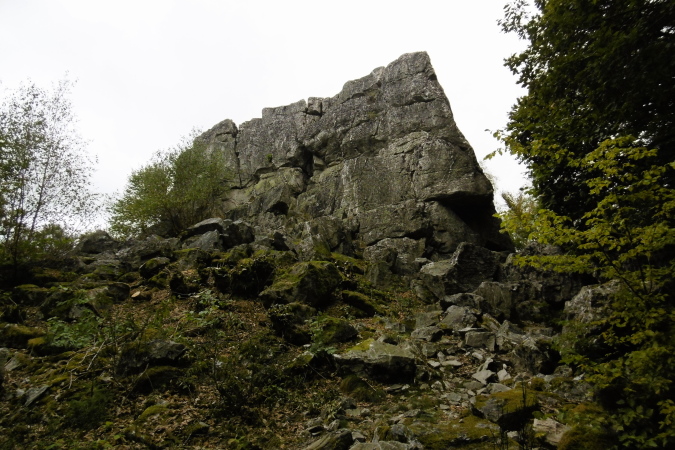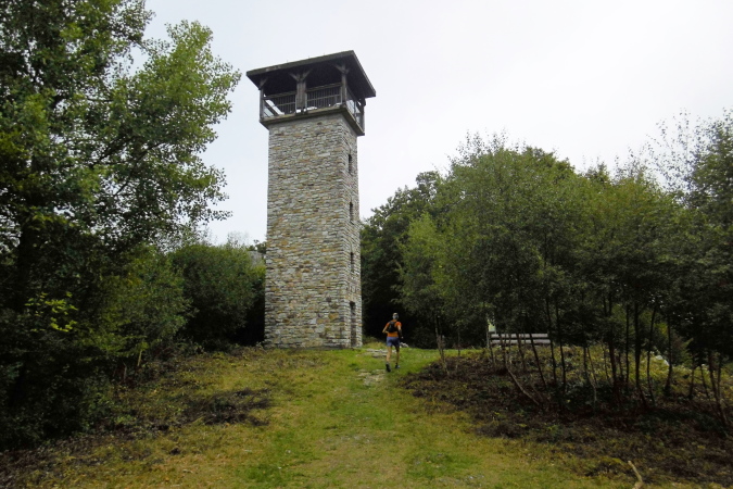 Beeindruckend war die Wegführung vor allem durch zwei kurze Tunnel, die in die Felsen gehauen waren, wie wir es eigentlich sonst nur von den Alpenstraßen kennen. Und kurz darauf bot sich uns ein toller Blick auf die weitläufige Anlage der Schmidtburg, die wir rechts von uns liegen ließen. Nur wenig später trafen wir dann auf die Grube Herrenberg, ein Schieferbergwerk und schließlich noch auf die rekonstruierte Keltensiedlung Altburg mit einigen Holzhäusern und einer Pallisade. Mit einem Wechsel über Wiesen, Felsenwege und Trails ging es meist bergauf zum Teufelsfels, wo sich nur wenige Meter davor die zweite VP (km 22) befand. Gleich danach kommen wir am Teufelsfels an einem wuchtigen Aussichtsturm vorbei, der mit Picknick- und Sitzgelegenheit zum Verweilen einlud. Versteckt zwischen den Bäumen war dann auch der wuchtige Felsblock Teufelsfels.