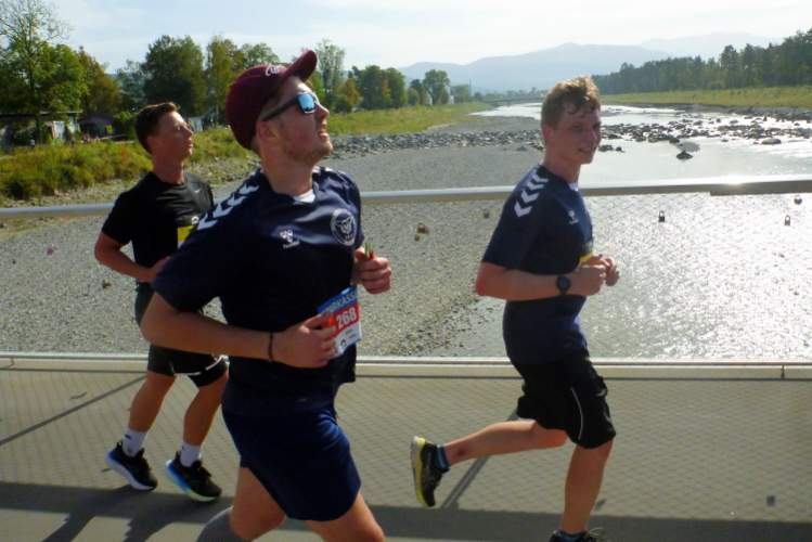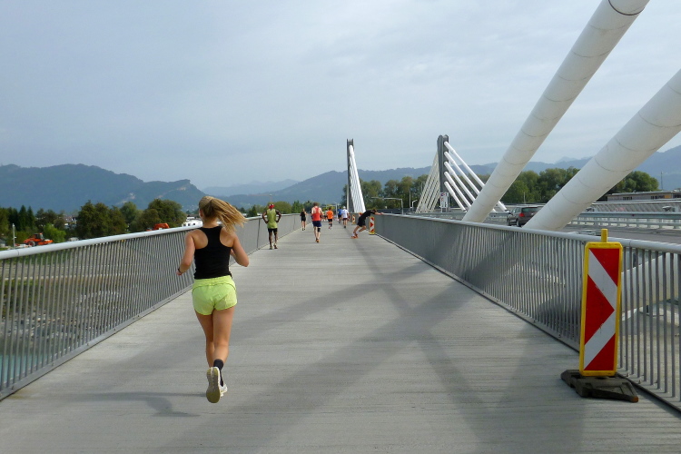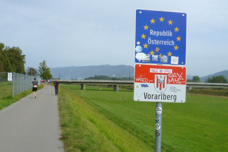 Später muss ich lachen, als ich auf einem Shirt lese: „Exercise? I thougth you said extra fries“. Wer braucht eine Übersetzungshilfe? Kurz nach Kilometer 19 kommt mir die erste Frauen entgegen. Auch sie ist auf der Jagd nach dem Streckenrekord. Gleich danach überqueren wir auf einer Radelbrücke die Dornbirner Ach und anschließend Vater Rhein auf der modernen Rheinbrücke. Auf der anderen Seite kommt uns die zweite Lady entgegen.
