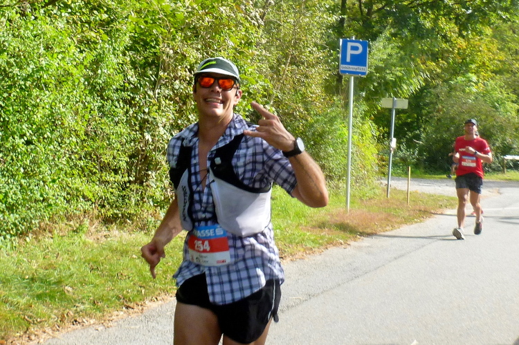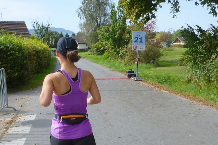 Kilometer fünf, bei der ersten Tanke wird schon eifrig zugelangt. Wasser, zwei Sorten Iso und Tee stehen im Angebot und später kommen noch Cola, Bananen, Riegel und Gel hinzu. 14 Trinkstellen sind eingerichtet, da braucht keiner dursten und hungern. Etwa 500 Meter danach verlassen wir Deutschland und sagen „habedieehre“ Austria, willkommen in Lochau lese ich auf einem Ortsschild. Kurzzeitig sind wieder mehr Zuschauer am Kurs, auch einige Kühe kommen aus einem Pferch angelaufen und schauen a bisserl deppert zu. Der Wald endet und wir haben nun freie Sicht auf den Bodensee. Kehrseite der Medaille, der Schweiß fängt an zu strömen.