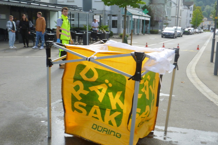 An die 20 Cheerleader Girls zeigen uns dann ihre Kunststücke. Die Zuschauer bekommen hier einiges geboten. Schade, dass der Marathoni weiterziehen muss. Gleich danach können wir erneut verpflegen, der Müll verschwindet im dahinter stehenden „Dräksak“. Ein paar Meter weiter musizieren recht schräg die „Wolfs Hüüler“, eine Guggenmusig aus Wolfshalden. Recht wild zusammengestellt von älteren Semestern bis hin zur Jugend. Dem Nachwuchs an den Trommeln hat man Gehörschutz verpasst. Ich muss lachen.
