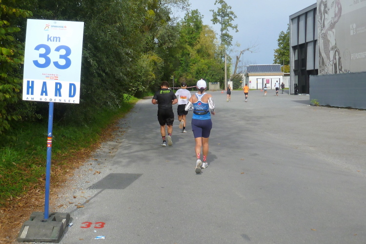 Drei, vier Kilometer sind etwas für das Gemüt, andere Läufer sagen, langweilig, denn wir laufen auf dem Unterhaltsweg des Rhein ohne Zuschauer. Nur hin und wieder sind Spaziergänger und Radfahrer zu sehen. Aber man hat einige Motivationsschilder aufgestellt mit den üblichen Sprüchen. Bei Kilometer 32 endet das Stück, das ich ohne groß nachzudenken absolviert habe. Wir sind wieder an der modernen Rheinbrücke angekommen, wo wir vor zwölf Kilometer auf der anderen Seite gelaufen sind. Die letzten Läufer sind durch und die Helfer sind bereits am Aufräumen. Die nächsten drei Kilometer führen uns auf der bekannten Strecke durch Hard hin zum Bodensee. So langsam merke ich die gelaufenen Kilometer, andere Läufer plagen sich zunehmend mit Muskelkrämpfen rum.