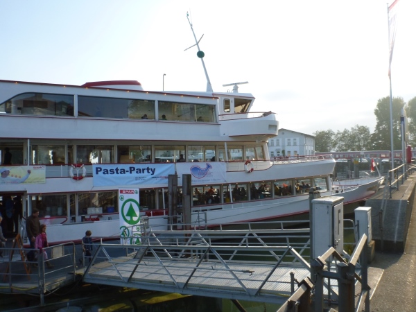 Die Pastaparty auf der MS Vorarlberg bietet nicht nur mir die Gelegenheit, die Kohlehydratspeicher aufzufüllen. Nudeln und mehrere Saucen stehen zur Auswahl bereit. Wer hungrig ist, kann sich bei den Köchen Nachschlag holen. Interessant ist, wie die Kapitäne mit ihren Schiffen hier im Hafen manövrieren müssen, um die Lücke zwischen Leuchtturm und Bayerischem Löwen (von 1856) zu erwischen. Wer noch geistlichen Beistand braucht, der kann sich den am Samstagabend in der St. Stephan-Kirche am Marktplatz holen. 42,195 Minuten soll der ökumenische Gottesdienst dauern.