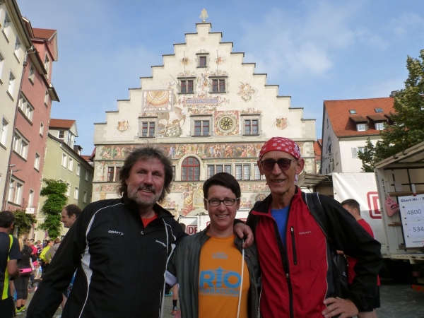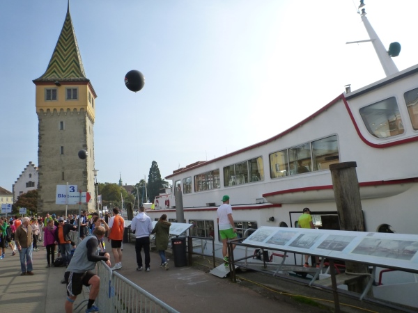 Nach viel Musik und den Grußworten von Oberbürgermeister Dr. Gerhard Ecker wird von zehn herunter gezählt und mit einem Schuss werden wir pünktlich um 11.20 Uhr auf die Strecke gelassen. Bahnhofsplatz und Zeppelinstraße sind die ersten Anlaufziele auf der Insel. Der Diebs- oder Malefizturm (1370 erbaut) zieht unsere Blicke an. Die finsteren Gesellen wurden hier früher eingesperrt. Nach nur wenigen Metern haben wir Platz zum Laufen. Das ist der Vorteil, wenn wir vorne starten. Aber auch hier sind einige unterwegs, die besser in den hinteren Startblöcken aufgehoben wären.