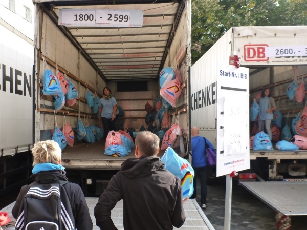 Die Kleider-Lkws stehen auf dem Reichsplatz, rund 100 Meter hinter dem letzten der sechs Startblöcke. Umkleiden ist auf einem eigens dafür vorgesehenen Schiff möglich, Getränke werden noch ausgeschenkt und am Info-Point werden noch die letzten Fragen gelöst.