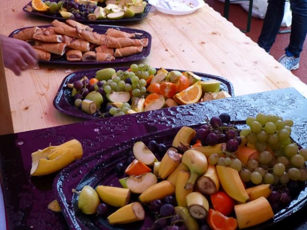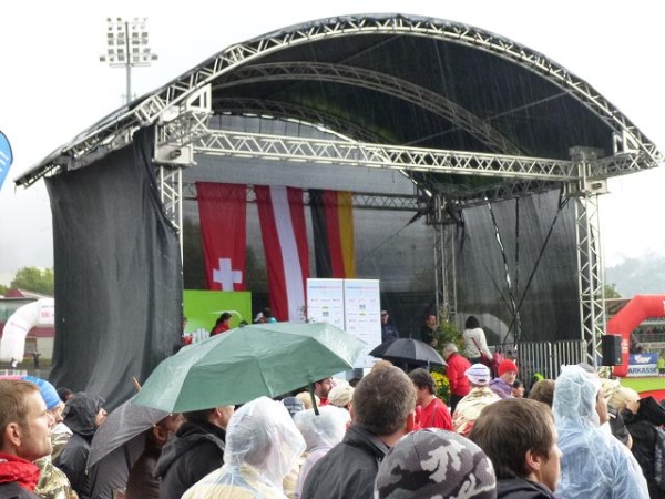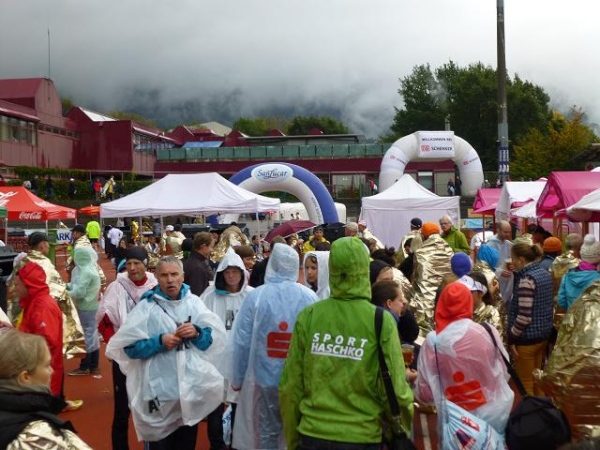 Sofort werden wir in Folie gehüllt und medaillendekoriert in den üppig ausgestatteten Versorgungsbereich geleitet. Obst, Kuchen und vieles andere gibt es hier in Hülle und Fülle. Nur der nächste große Duscher vom Himmel hält mich davon ab, hier länger zu verweilen. Dafür bietet aber die überdachte Tribüne beste Gelegenheit regengeschützt einfach mitzufeiern.