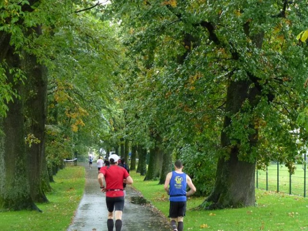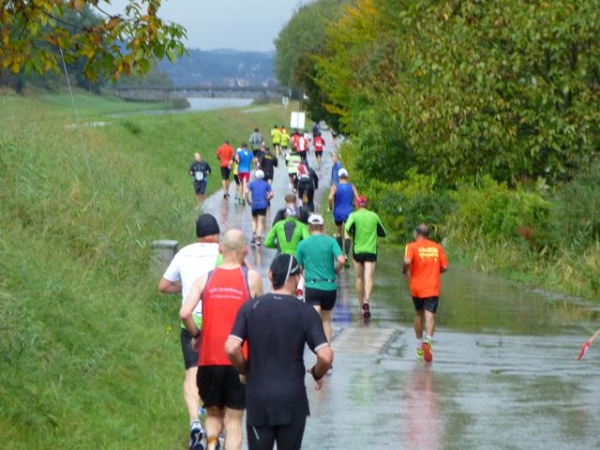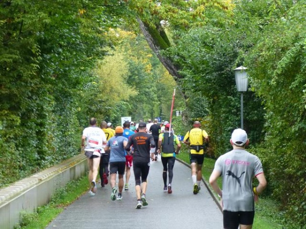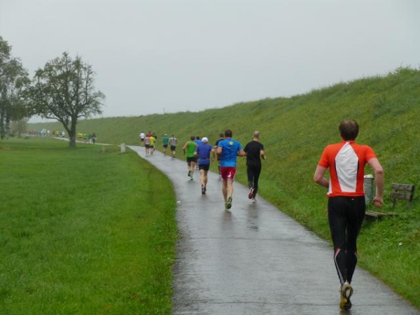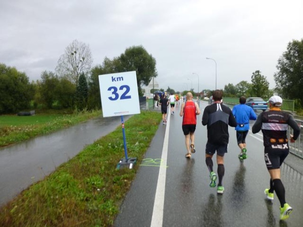 Das verbliebene Läuferfeld hat sich schon weit auseinander gezogen, die Kräfte lassen nach, es beginnt die Zeit, in der sich sich marathonisch die Spreu vom Weizen bzw. der Möchtegern- (gehende) vom wahren (durchlaufenden) Marathoni trennt. Allen gemeinsam ist jedoch die mit Länge der Laufstrecke zunehmende Vorfreude auf die Verpflegungsstationen. Und mit denen ist der Kurs selbst in der Einsamkeit reichlich bestückt: Alle 5 km erwartet uns „full service“ mit Wasser, Isogetränken, Tee, später auch Cola und Gels, Energieriegeln und Bananen. Ab km 12,5 ist dazwischen jeweils noch ein Getränkeausschank postiert, sodass man zwischen Start und Ziel stolze 14 Mal ein Alibi hat, einen Regenerationsstop einzulegen. So viel Wässerung ist zwar heute gar nicht nötig, aber es motiviert doch immer wieder, den nächsten Verpflegungsposten anlaufen zu dürfen.