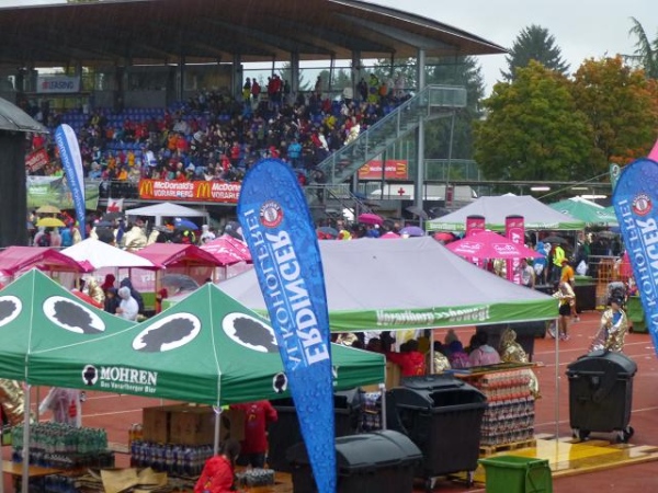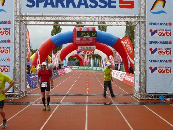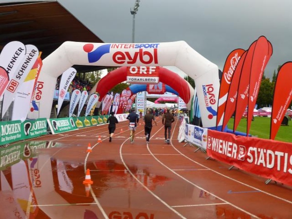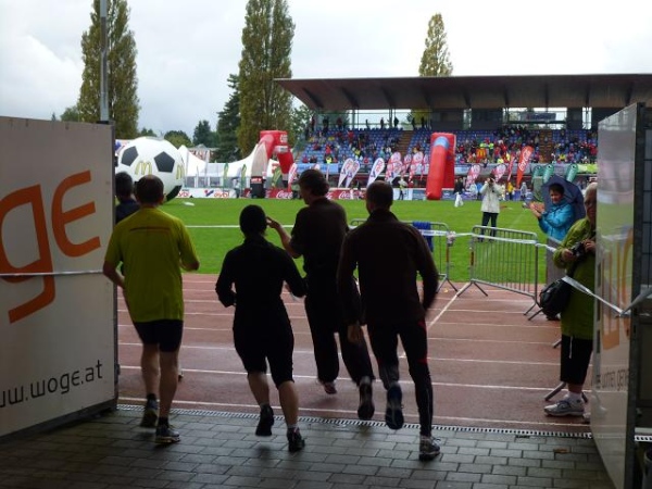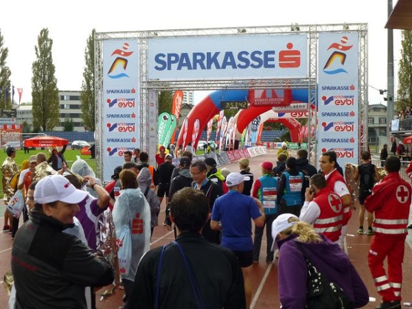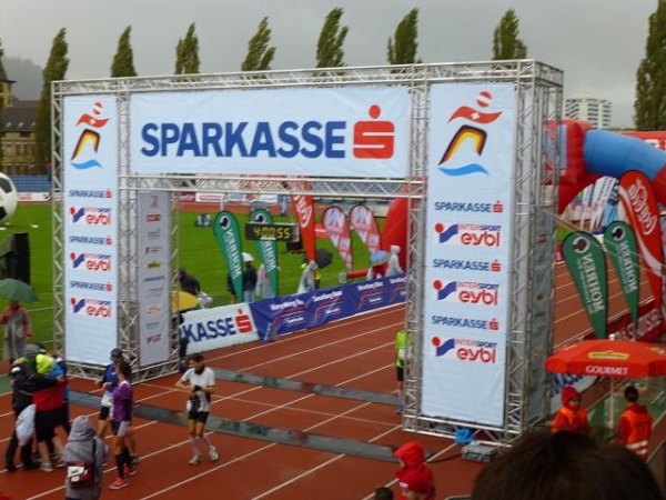 Schon der erste Blick ins Stadion lässt sämtliche Anstrengung verfliegen. Applaus brandet uns von der dicht besetzten Tribüne und entlang der Zielgeraden entgegen, über Lautsprecher werden die Ankömmlinge persönlich begrüßt. Die letzten Meter über die fahnengesäumte und bogenüberspannte rote Tartanbahn werden zum Triumphzug für jeden Einläufer. Was für ein mitreißendes Finale!