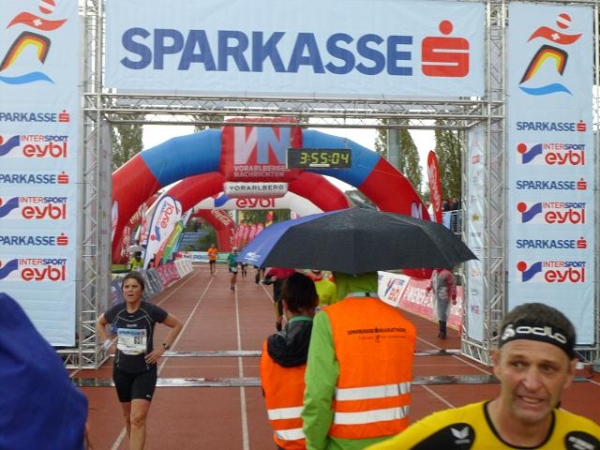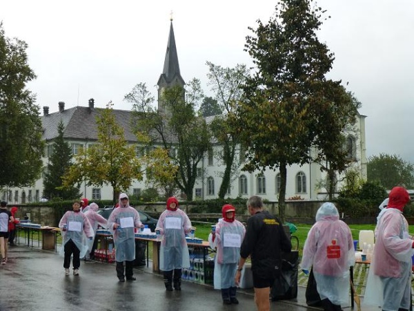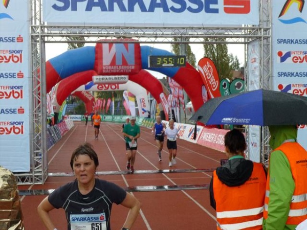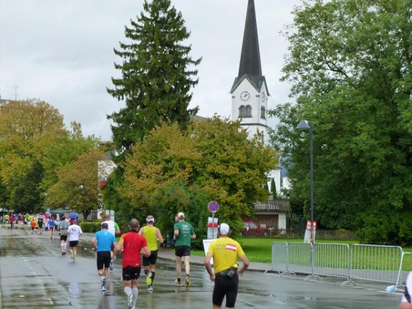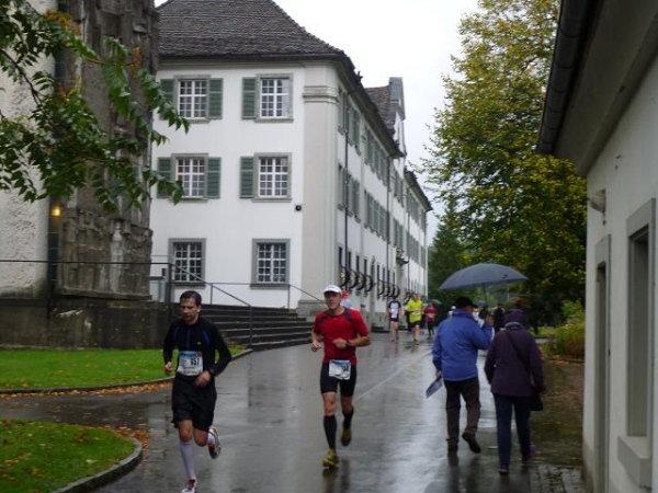 Ein Streckenhighlight auf unserem Rückweg ist bei km 40 die weitläufigen Territorialabtei Wettingen-Mehrerau, einem bereits im 11. Jh. gegründeten Zisterzienserkloster, das heute auch ein Sanatorium und ein Gymnasium mit Internat betreibt. Mitten hindurch führt unser Weg und weiter über eine wunderschöne Allee bis zu dem am Bodensee entlang führenden Strandweg. Von hier lässt sich das nahe Ziel schon erahnen. Eine Schleife halb um das Casino-Stadion herum müssen wir zuletzt noch drehen, dann erst öffnet sich für uns das Tor zum Zieleinlauf.