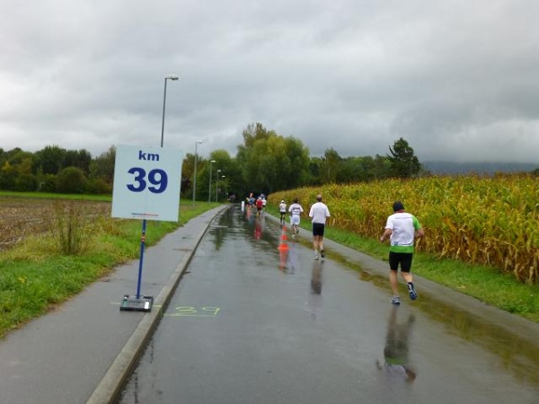 Mit Cheerleader-Girls und Musik werden wir im Herzen von St. Margrethen empfangen. Dass trotz der bescheidenen Wetterverhältnisse so viele Leute den Weg an die Strecke gefunden haben, freut uns Läufer natürlich besonders. Nicht ganz so prickelnd ist allerdings der Rest unseres Schweiz-Ausflugs. Denn der führt in langen Geraden durch das Gewerbegebiet „Rheinpark“. Am interessantesten ist da noch der Rohbau einer neuen Stahlbrücke. Eine weitere Autobahnbrücke katapultiert uns bei km 28,5 zurück in die grüne Wiesenlandschaft entlang des Rheins und zurück nach Österreich.