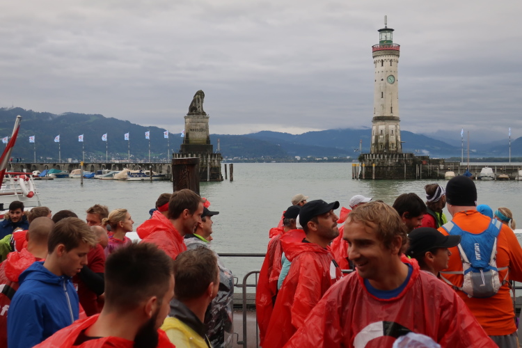 Vor dieser Kulisse strömen aus allen Himmelsrichtungen die Läufer herbei, sei es besonders stimmungsvoll per Schiff-Shuttle von Bregenz aus, besonders körpernah per Schnellbahn über den hafennahen Hauptbahnhof oder besonders praktisch einfach zu Fuß durch die winkeligen Gassen der Altstadt. Das Gewühl ist übersichtlicher als in meiner Erinnerung, was insbesondere daran liegen dürfte, dass die Läufer des Viertel- und Halbmarathons anders als damals nicht mehr gemeinsam mit den Marathonis starten, sondern eine Dreiviertelstunde später.