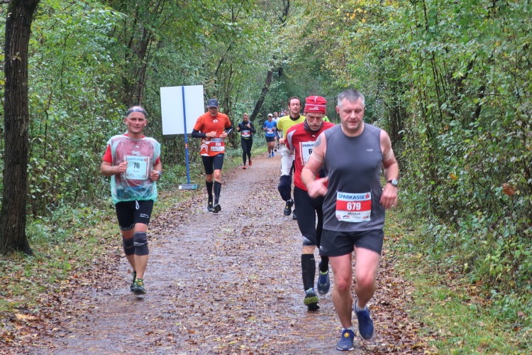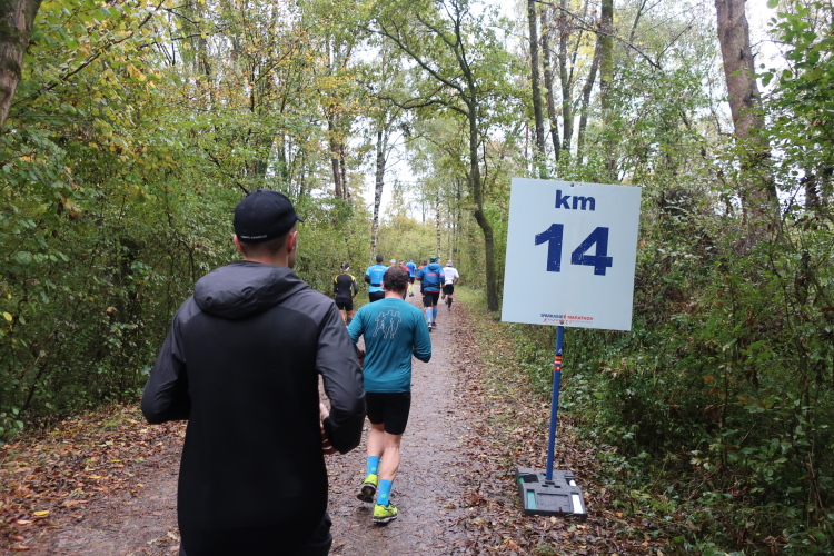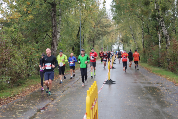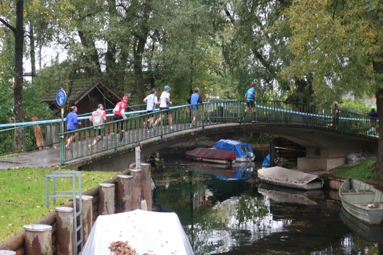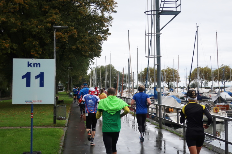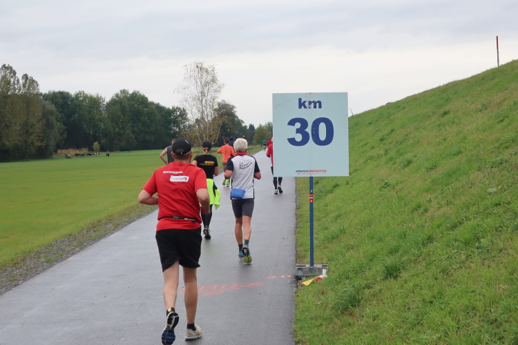 Das Läuferfeld hat sich weit auseinander gezogen, die Kräfte lassen nach, es beginnt die Zeit, in der sich marathonisch die Spreu vom Weizen bzw. der Möchtegern- (gehende) vom wahren (durchlaufenden) Marathoni trennt. Allen gemeinsam ist jedoch die mit der Länge der Laufstrecke zunehmende Vorfreude auf die Verpflegungsstationen. Und mit denen ist der Kurs selbst in der Einsamkeit reichlich bestückt: Alle 5 km erwartet uns „full service“ mit Wasser, Isogetränk, Tee, später auch Cola und Gels, Energieriegeln und Bananen. Ab km 12,5 ist dazwischen jeweils noch ein Getränkeausschank postiert, sodass man zwischen Start und Ziel stolze 14 Mal ein Alibi hat, einen Regenerationsstopp einzulegen. So viel Wässerung ist zwar heute gar nicht nötig, aber es motiviert doch immer wieder, den nächsten Verpflegungsposten anlaufen zu dürfen.