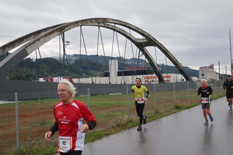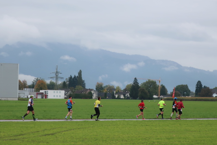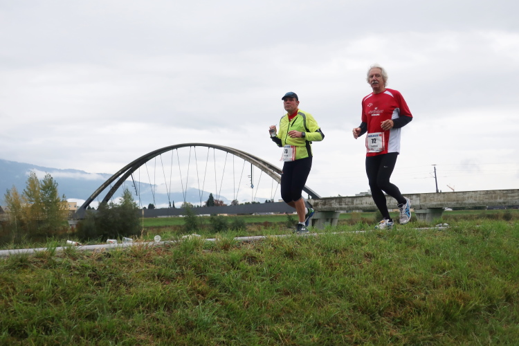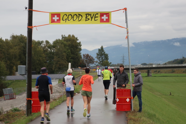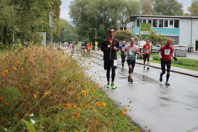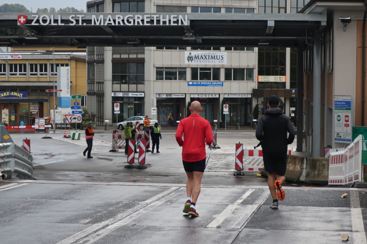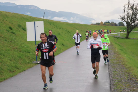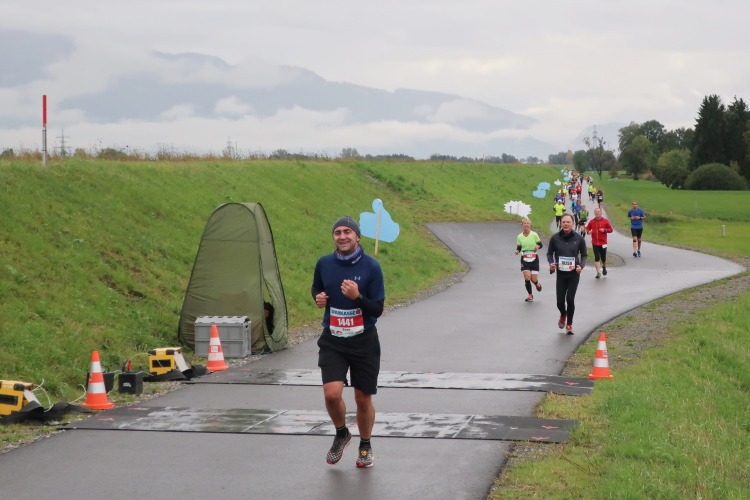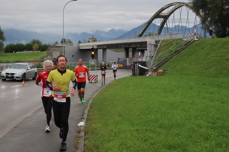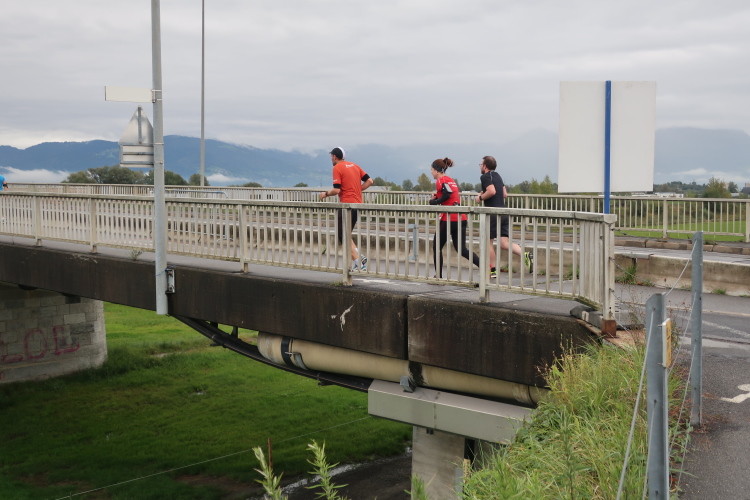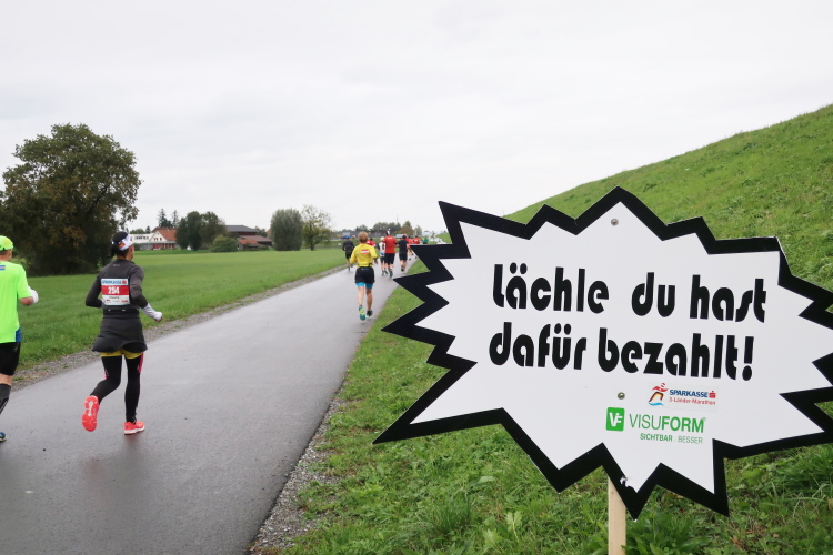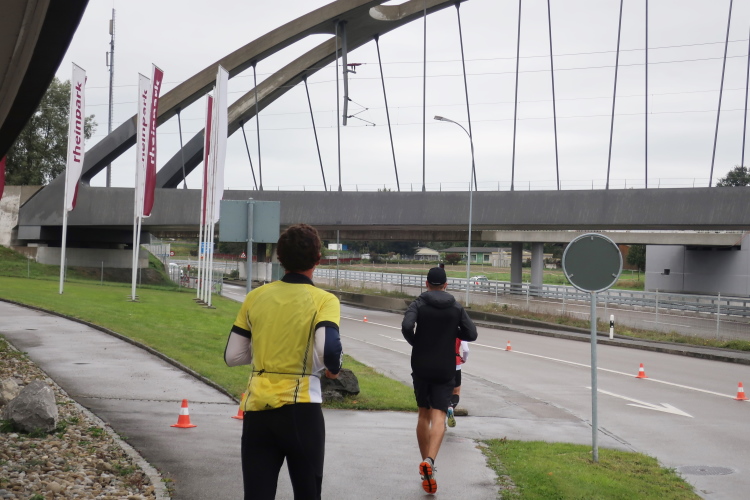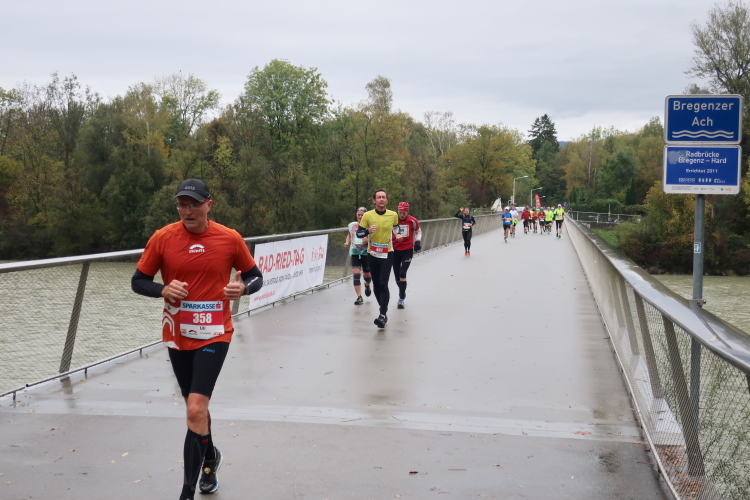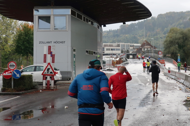 Die folgenden Kilometer durch die verstreuten Wohn- und Gewerbegebiete Hards gehören nicht unbedingt zu den besonders spannungsgeladenen. Interessant wird es wieder, als wir der Dornbirner Ach folgend bei km 20 die Rheinstraße erreichen, jene häufig überlastete Hauptdurchgangsstraße, die vor allem pickerl-geizende Deutsche gerne nutzen, um via Bregenz in die Schweiz zu gelangen. Vor fünf Jahren mussten wir uns die hier anstehende Passage über den Rhein noch mit dem automobilen Verkehr teilen. Heute gehört die Rheinbrücke ganz uns – der übrige Straßenverkehr wird gen Süden abgeleitet. Ein eindrucksvoller Beleg, welchen Stellenwert die Veranstaltung in der Region mittlerweile hat.