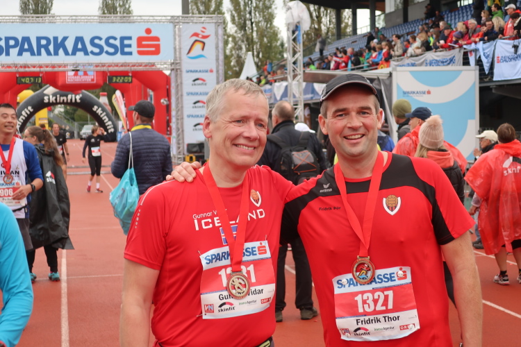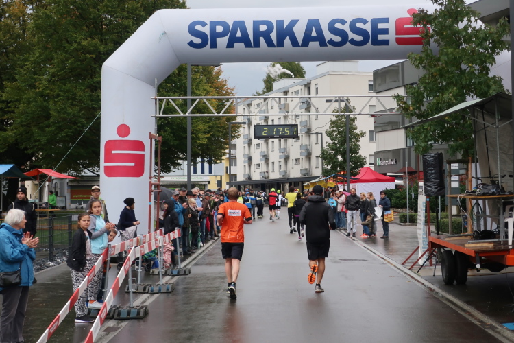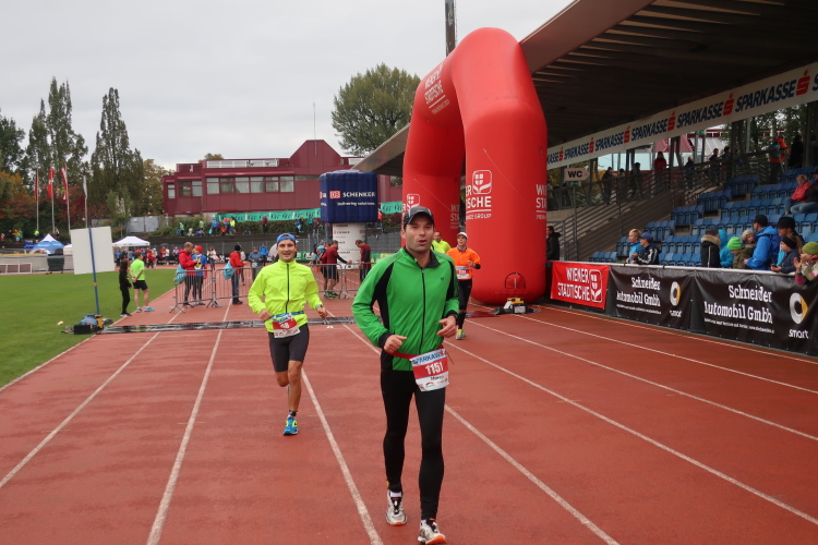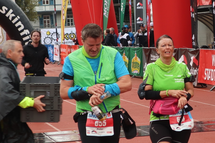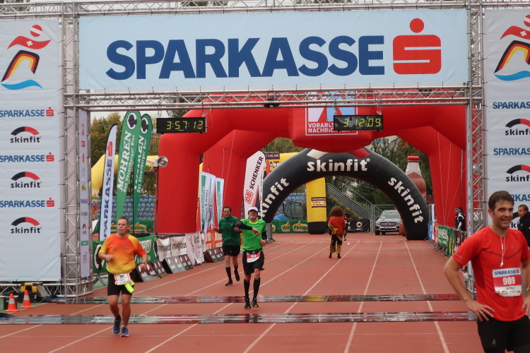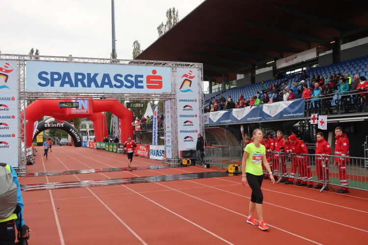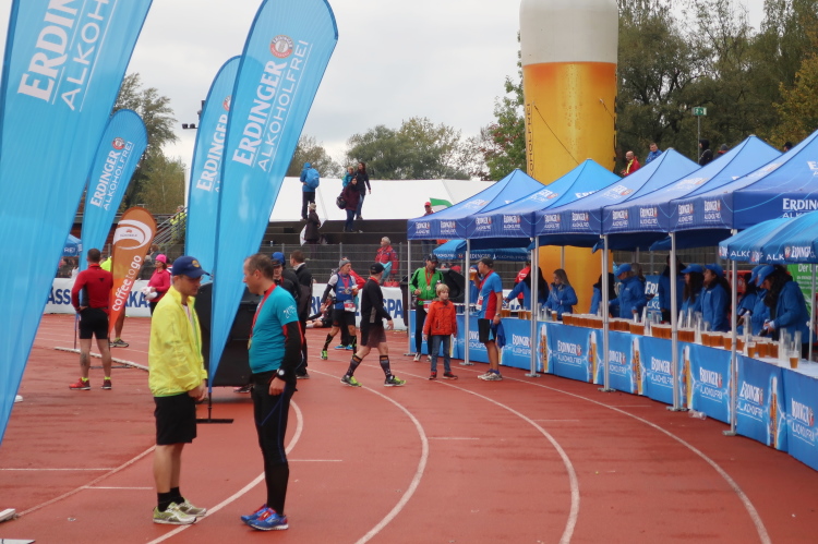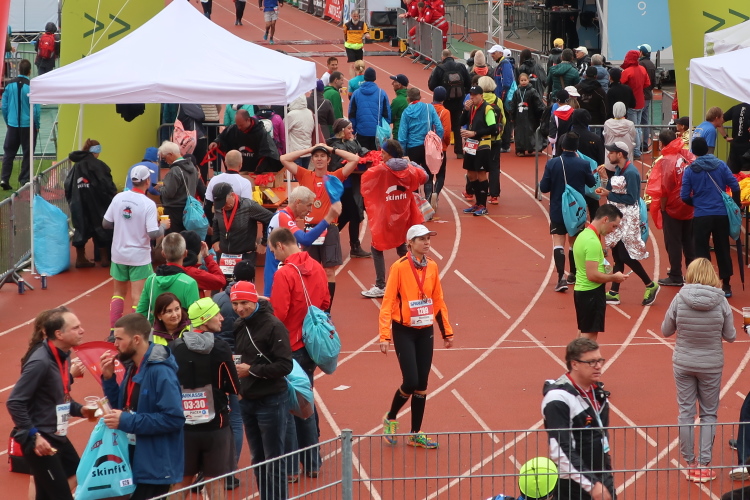 Die finalen zweihundert Meter stehen an. Auf der roten Tartanbahn des Stadions sind sie zu absolvieren, eine halbe Stadionrunde lang. Applaus brandet uns von der Tribüne und aus dem Zielraum entgegen, über Lautsprecher werden die Ankömmlinge vom Zielmoderator persönlich begrüßt. Die letzten Meter über die fahnengesäumte und bogenüberspannte Bahn werden zum Triumphzug für jeden Finisher.