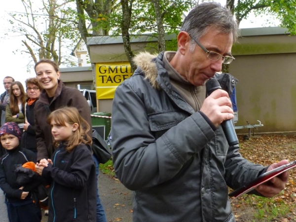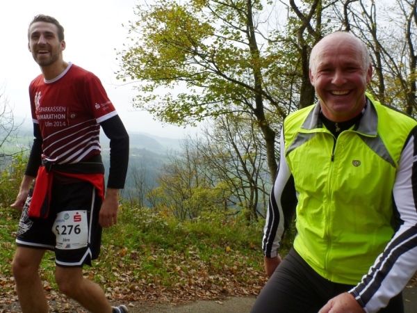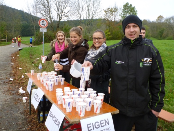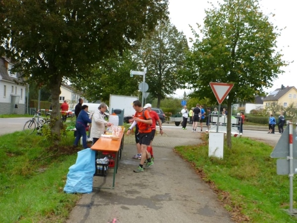 Kilometer 32: An einer Kreuzung, nach Westen geht es nach Wißgoldingen, beginnt die Runde zur Reiterleskapelle. Die freundlichen Helfer an der V-Stelle haben doppelte Arbeit, denn wir wollen vor dem Hinweg und nach dem Rückweg etwas zu trinken und zu essen. Außerdem müssen die Läufer auf den rechten Weg eingewiesen werden. Nicht dass einer in seinem Laufdelirium in eine Endlosschleife kommt. Die Ortsverbindungsstraße nach Tannweiler verläuft ein wenig wellig westlich und südlich des Schönbergs. Auf der Gegenseite kommen immer wieder Läufer von ihrer Runde zurück, darunter auch der Nürnberger Anton Luber, der freundliche Handicap-Runner.