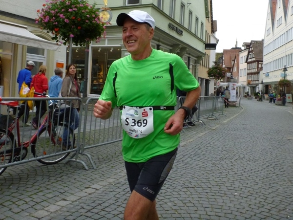 Dann sehe ich ein auffälliges Trikot der AST Süßen, ein Verein, der gleich mit rund 20 Läufern hergekommen ist. Dieter Pflüger hat mit meinem Erscheinen von hinten überhaupt nicht gerechnet. In Imst beim Gletschermarathon habe ich ihn hinunter zum Inn geschleift, auch in Davos sind wir vor ein paar Jahren einige Kilometer gelaufen. Und heute? Er kann mein Tempo nicht ganz mitgehen.