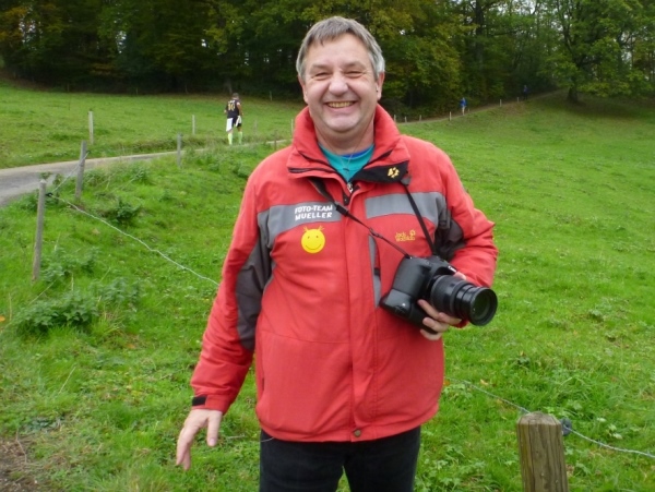 Am Wanderparkplatz vor Tannweiler biegen wir nach rechts ab. Ein Feldweg führt die 50 Höhenmeter arg steil nach oben. Alles marschiert. Unten wird abermals die Zeit genommen. Ein Läufer hat sich auf der Bank niedergelassen. Wahrscheinlich liegt das Aufbaugetränk hinter der Bank, für Schnorrer wie mich unsichtbar und doch gekühlt. Oben auf der Passhöhe zwischen Rechbergle (Schwarzhorn) und Graneggle, da endet die Steigung, sehen wir bereits die Reiterleskapelle (642 Meter). Die daneben stehende Sommer-Linde hat ihr Laub zur Gänze bereits abgeworfen.