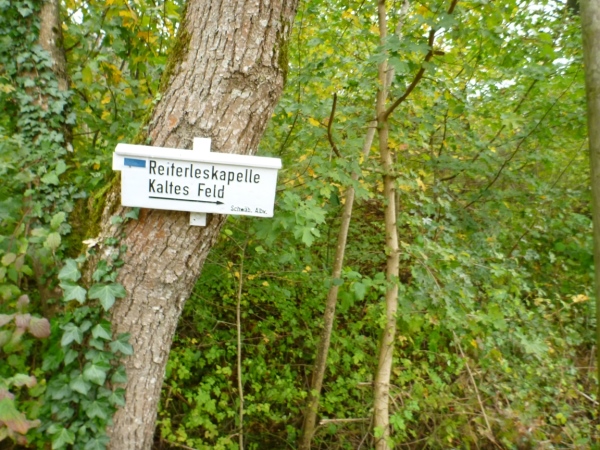 Im Gegensatz zu den beiden anderen Kaiserbergen ist der Stuifen nicht bebaut. Auch bietet er keine Aussicht, denn der höchste Punkt ist bewaldet. Die Drei Kaiserberge kamen zu dem Namen, weil der Hohenstaufen die Stammburg des Königs- und Kaisergeschlechtes der Staufer trug. Zum Wallfahren und zur Jagd gingen die Herrschaften natürlich auf „ihre“ Berge. Heute bilden die drei markanten Zeugenberge zusammen mit dem Aasrücken und dem Rehgebirge ein Landschaftsschutzgebiet. Unten zeigt uns ein Wanderschild zur Reiterleskapelle und zum Kalten Feld.