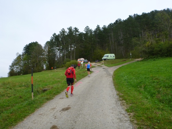 Etwa mit dem 28. Kilometer befinden wir uns am Fuß des Stuifen. Ein paar Sanis stehen und regeln den Läuferverkehr, denn die Runde auf und um den Stuifen beginnt und endet hier. Übrigens, nicht jeder Kilometer ist ausgeschildert, aber einen ungefähren Eindruck, wie weit man noch zu laufen hat, hat man immer. Viele laufen heutzutage ja mit GPS und lassen sich die Kilometer einsagen.