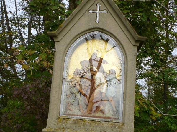 1714 wurde die Kapelle erbaut, vermutlich von einem Bauern namens Reuterles aus dem nahen Tannweiler. Der Autor sucht Besinnung in dem Gotteshaus. Das Innere ist sehr schlicht gehalten. Ich sehe eine Statue des Patrons der Kapelle, des heiligen Leonhard von Limoges, dem Schutzpatron der Pferde.