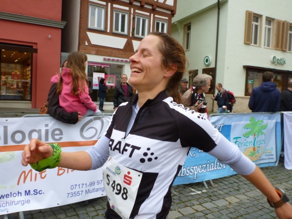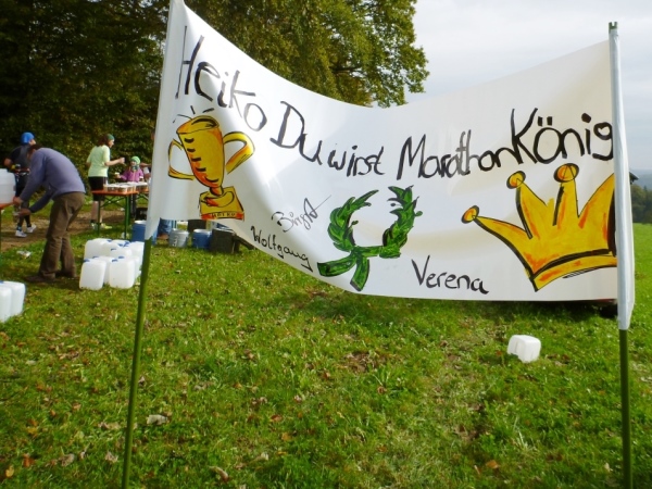 Wir bleiben nun auf dem Straße an der Rems und drehen noch eine Runde um einen Fußballplatz, wo den dortigen Sportlern eine Ausdauereinheit auch nicht schaden dürfte. Der letzte Kilometer wird noch im Grünen angezeigt, dann laufe ich an einer Trommlerformation vorbei durch die Bocksgasse zur Stauferstele, wo das Zieltransparent hängt. Viele Zuschauer haben sich hier versammelt. Ich bin happy, auch wenn ich fünf Minuten mehr als fünf Stunden unterwegs war.