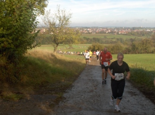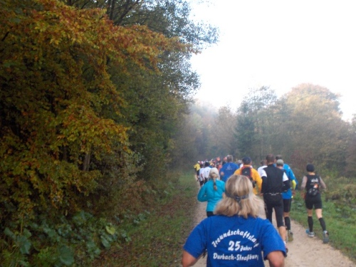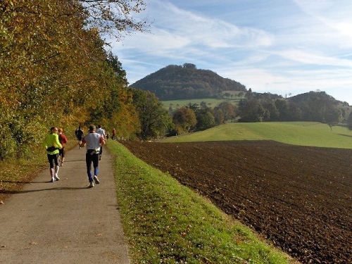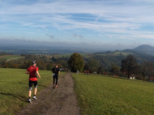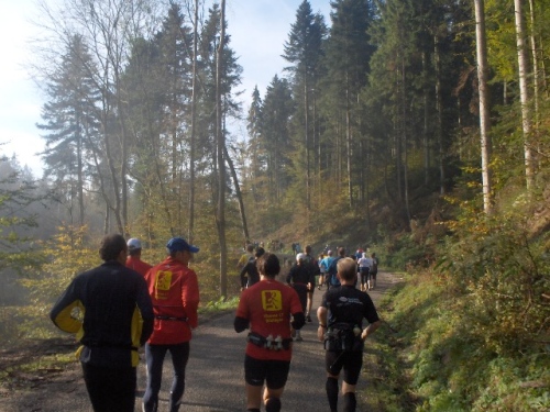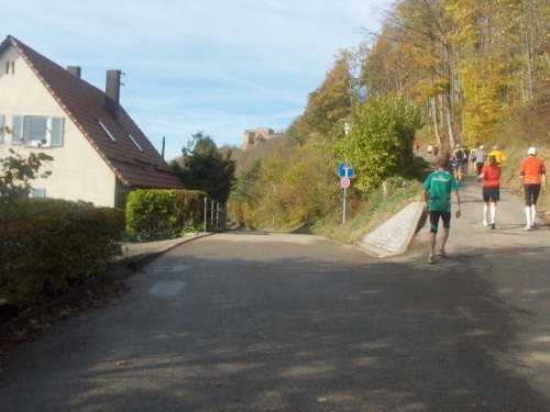 Nun wurde es ernst. Der Anstieg zum Hohenstaufen war zunächst auf gut zu laufendem Asphalt zu bewältigen. Dann wechselte aber der Untergrund in einen matschigen und schmierigen Trail, der das Vorwärtskommen erschwerte. Den Sturm auf den Gipfel mussten wir über einen schmalen, von Fahr- und Laufspuren malträtierten Naturweg bewältigen. Hier galt es besonders, die Konzentration zu behalten, kamen uns doch zusätzlich noch die Läufer entgegen, die den Hohenstaufen bereits bezwungen hatten.