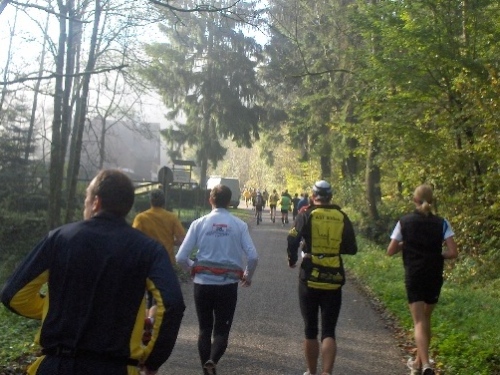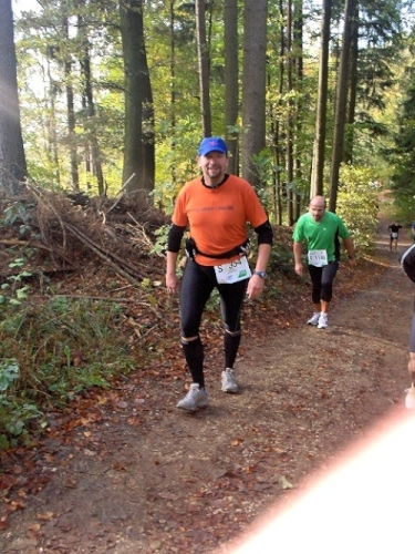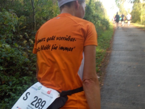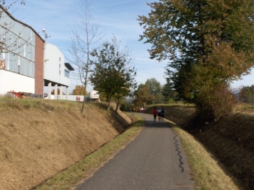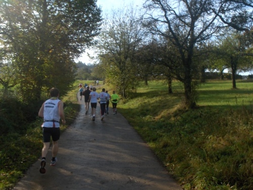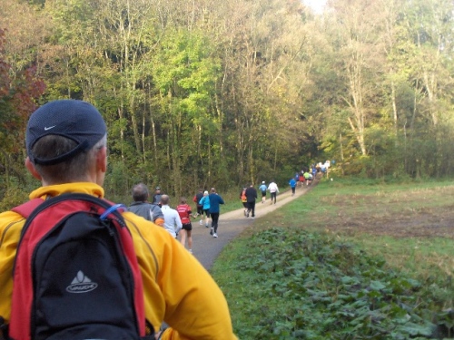 Eine weitere kurze Begegnungsstrecke, die stark an die Mecklenburgischen Seenplatte erinnerte, führte uns zum dritten und letzten Wendepunkt dieses Laufes. Abermals wurden wir handschriftlich erfasst und konnten uns anschließend an die letzten Kilometer nach Schwäbisch Gmünd machen. Ich erreichte wieder die asphaltierte Begegnungsstrecke und begegnete Bernie. Auch er war im Auftrag von m4y unterwegs. Ein kurzer Plausch und es ging weiter.