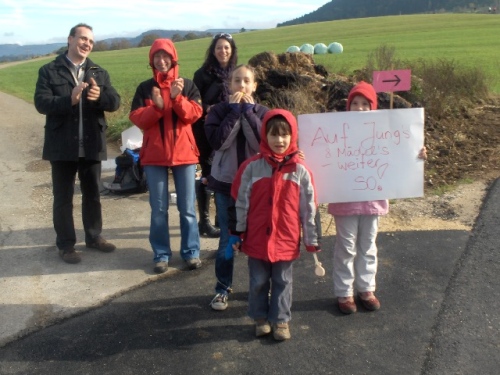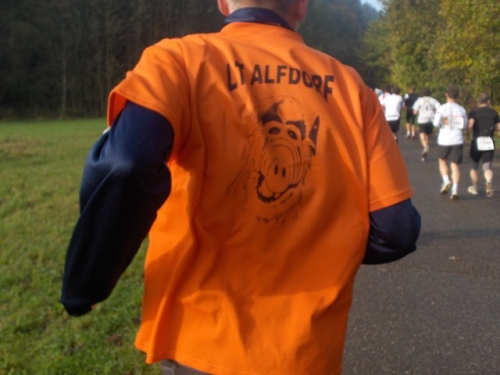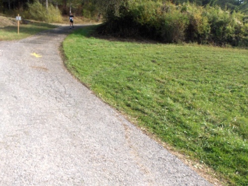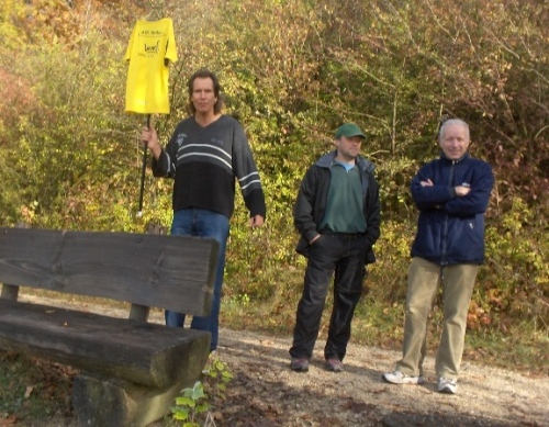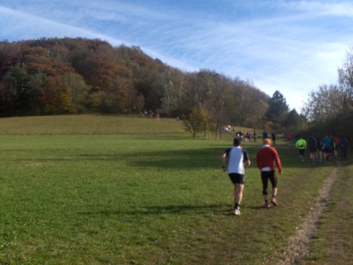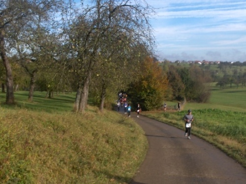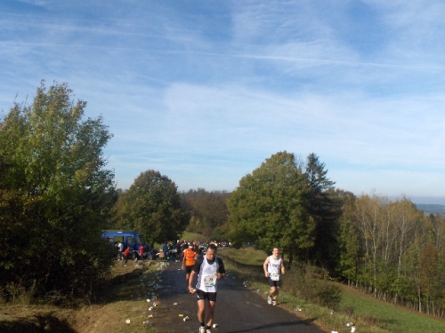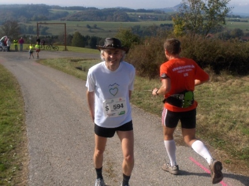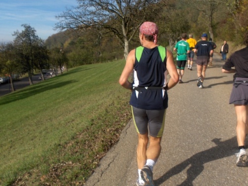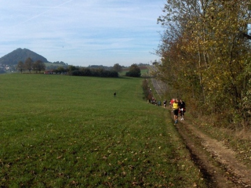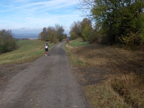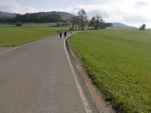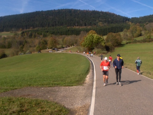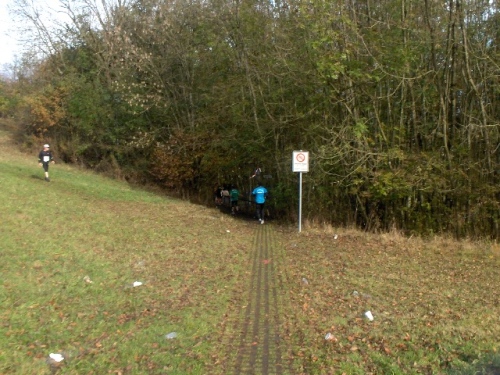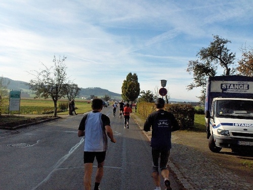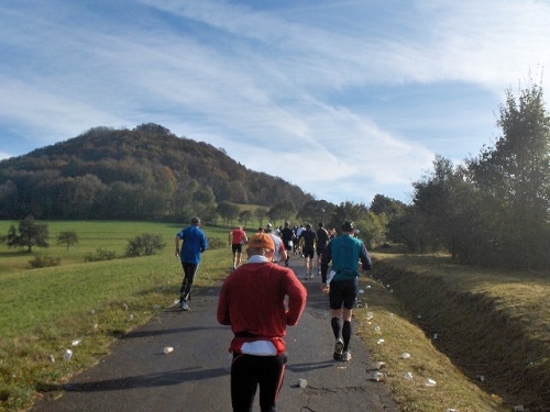 Entlang der Landstraße verflogen die folgenden Kilometer wie im Fluge, bis ein weiterer Trail auf uns wartete. Oben angekommen stand dort ein Lockenkopf in grauem Pullover mit einem gelben T-Shirt als Standarte in der Hand. Den kannte ich doch vom Hohenstaufen. Spielten mir meine Sinne schon Streiche? Nein, es waren Zwillingsbrüder, die sich gleich gekleidet an diesen beiden Punkten postiert hatten, um die Läufer anzufeuern (und zu verwirren).