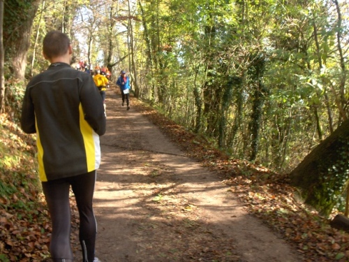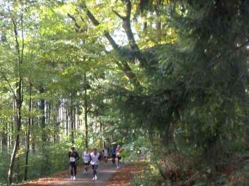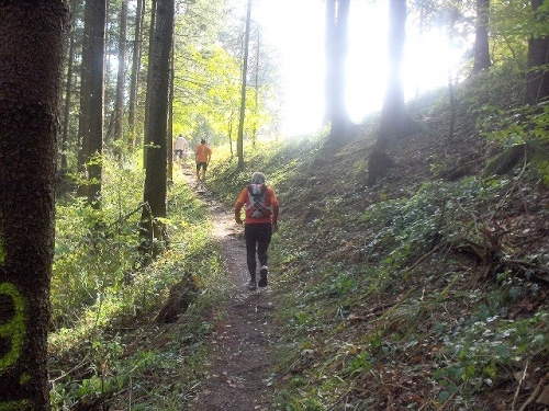 Über Rasengittersteine kamen wir in ein Waldstück in dem es auf schmalen Naturwegen in Mäandern nach unten ging. Da auf demselben Pfad die Finisher des Rechberglaufs auf ihrem Weg zum Shuttle-Bus unterwegs waren, war hier äußerste Konzentration gefordert. An besonders neuralgischen Stellen verhinderten Geländer einen unfreiwilligen Abflug ins Unterholz.