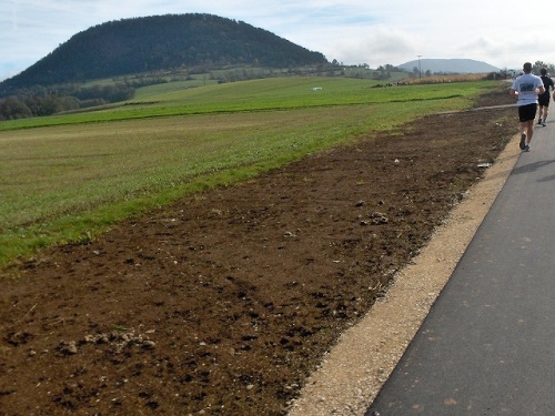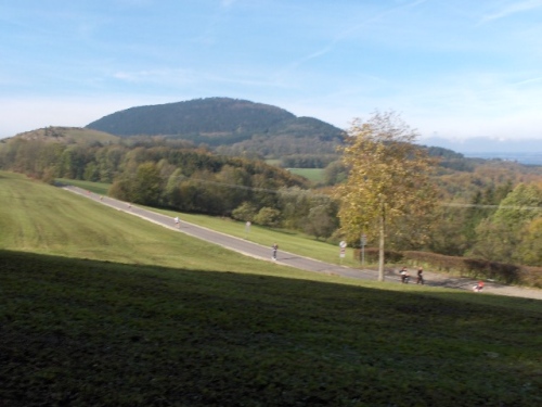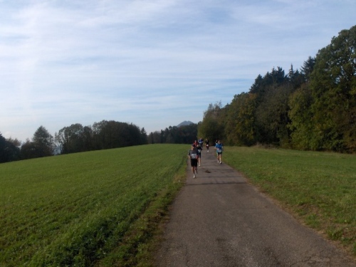 Am Fuße des Stuifens wieder angekommen, begegnete mir wieder der Erwin Bittel. „Viel Erfolg und Spaß auf den letzen Kilometern“, wünschten wir uns gegenseitig. Ein starker Gegenwind blies uns nun auf den folgenden leicht welligen Kilometern ins Gesicht, was dem Vorwärtskommen und der bereits malträtierten Muskulatur nicht gerade zuträglich war. Es folgte eine rund zwei Kilometer lange asphaltierte Begegnungsstrecke, bevor es abermals auf einen Berg ging. Wir wurden aber vom Gipfelsturm verschont und konnten diesen Berg auf halber Höhe umrunden.