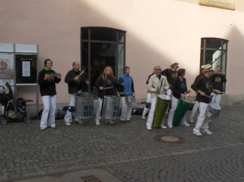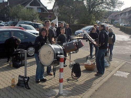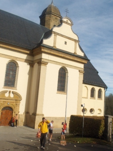 Wir ließen den Trail hinter uns und konnten auf Asphaltstraßen nach Rechberg laufen. In einer Haarnadelkurve hatten sich zahlreiche Zuschauer postiert, die einen den Rechberg hinauf zur Wallfahrtskirche St. Maria Hohenrechberg trieben. Schade, die dort postierte Musikkapelle legte gerade eine Pause ein. Kaum hatte ich mich aber an den Schlußanstieg zum Gipfel des 700 Meter hohen Rechberges gemacht, ertönten wieder Klänge aus den Instrumenten dieser Band.