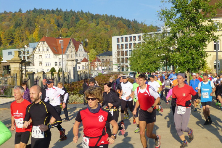 Zu den Traditionen des Albmarathons gehört, dass am Lauftag (fast immer) „goldener Oktober“ angesagt ist. Und diese Tradition gilt auch und erst recht für den Jubiläumslauf. Kurz vor dem Start reißt der Hochnebel auf und die Sonne ergießt ihre wärmenden Strahlen über uns. Sogleich wird es deutlich voller auf dem Johannisplatz vor dem Prediger. Ebenso vor dem hier als Kleiderdepot aufgebauten Zelt. Ausnehmend schön ist die Kulisse um uns herum: Hier die uralte romanische Johanniskirche, dort das mächtige Kirchenschiff des Heilig-Kreuz-Münsters, das die Dächer der Bürgerhäuser überragt.