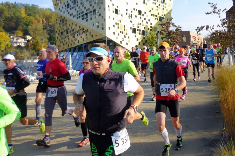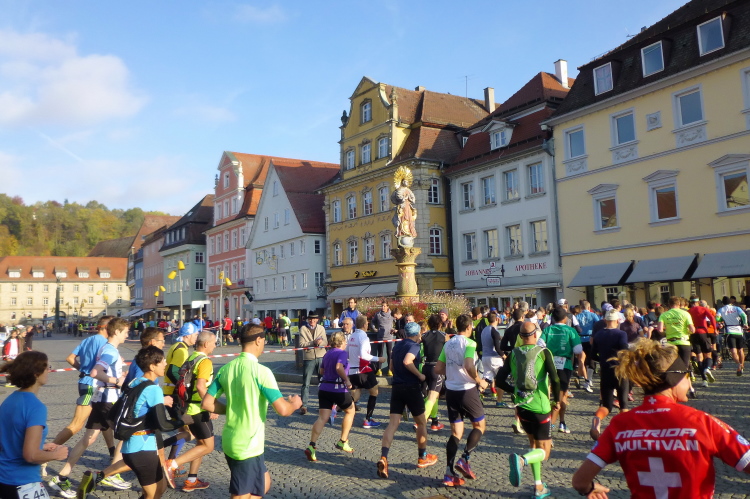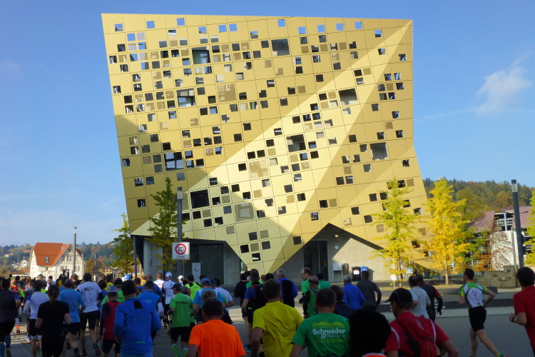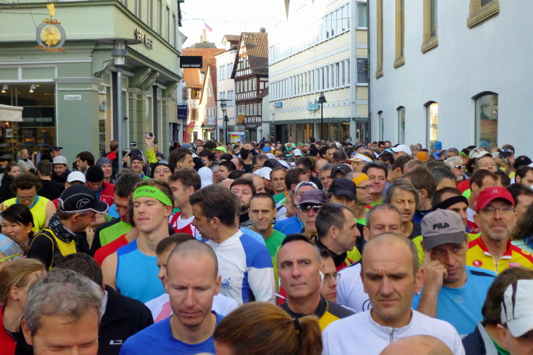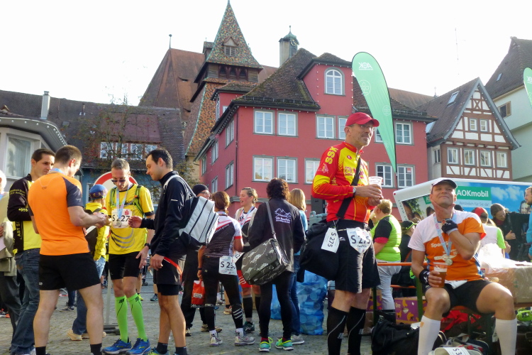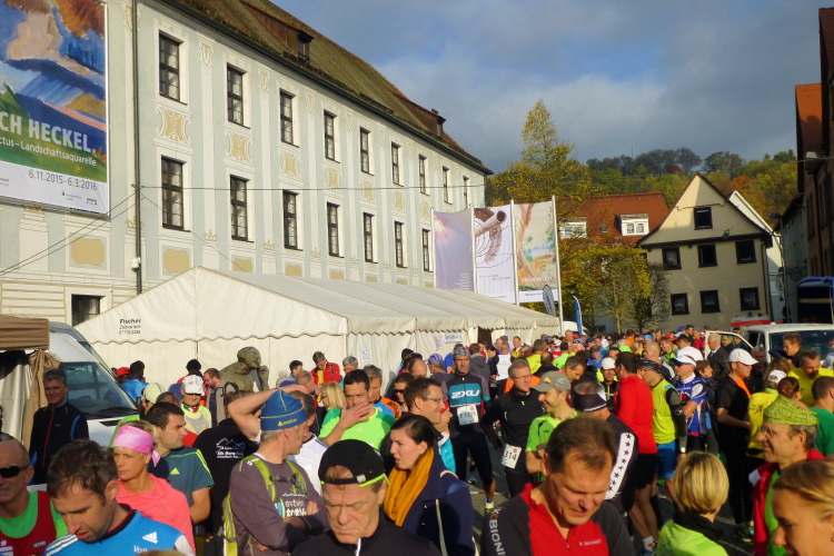 Idyllisch geht es los, mitten im Herzen Schwäbisch Gmünds, etwa 50 km vor Stuttgart gelegen. Der mittelalterlich geprägte Stadtkern bietet eine pittoreske Kulisse für den Start wie auch für das Ziel. Mittendrin: Der „Prediger“, ein ehemaliges Dominikanerkloster, das via Kaserne zum Kulturzentrum mit Museum und Galerie umfunktioniert wurde. Eine chice Melange aus historischen und modernen Elementen bietet die zentrale, drei Stockwerke hohe Halle im Kern des „Predigers“. Die Ausgabestelle der Startunterlagen und eine kleine Messe finde ich hier. Und die zentrale Begegnungsstätte all jener Läufer, die leichtgeschürzt angesichts der Morgenkühle Nestwärme suchen. Eine lange Schlange wartet geduldig vor dem Nachmeldeschalter.